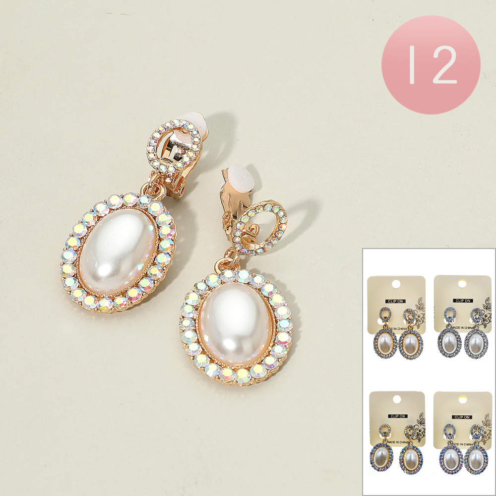 Details • Size : 0.75" X 1.75" • Clip On • Elevate your look with these oval pearl drop clip-on earrings, framed by a sparkling rhinestone halo. Designed for non-pierced ears, these timeless earrings blend classic elegance with modern shine, making them perfect for weddings, parties, and formal occasions.