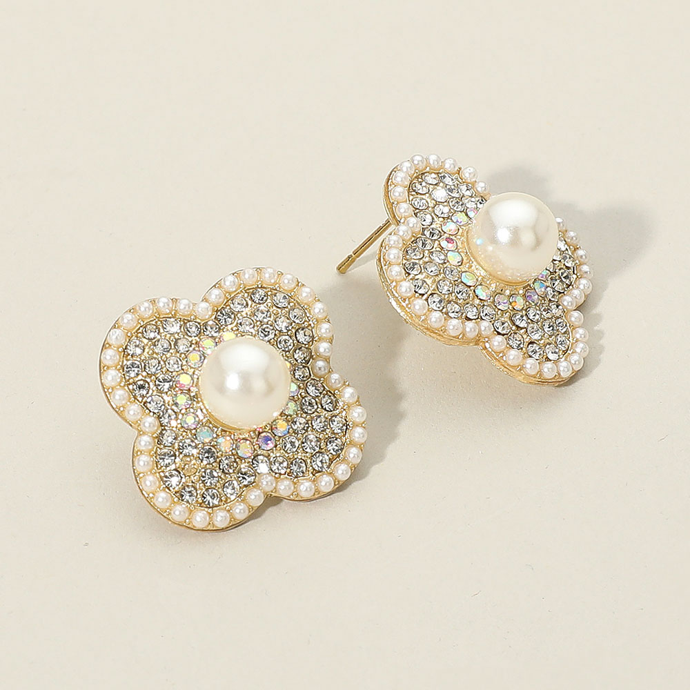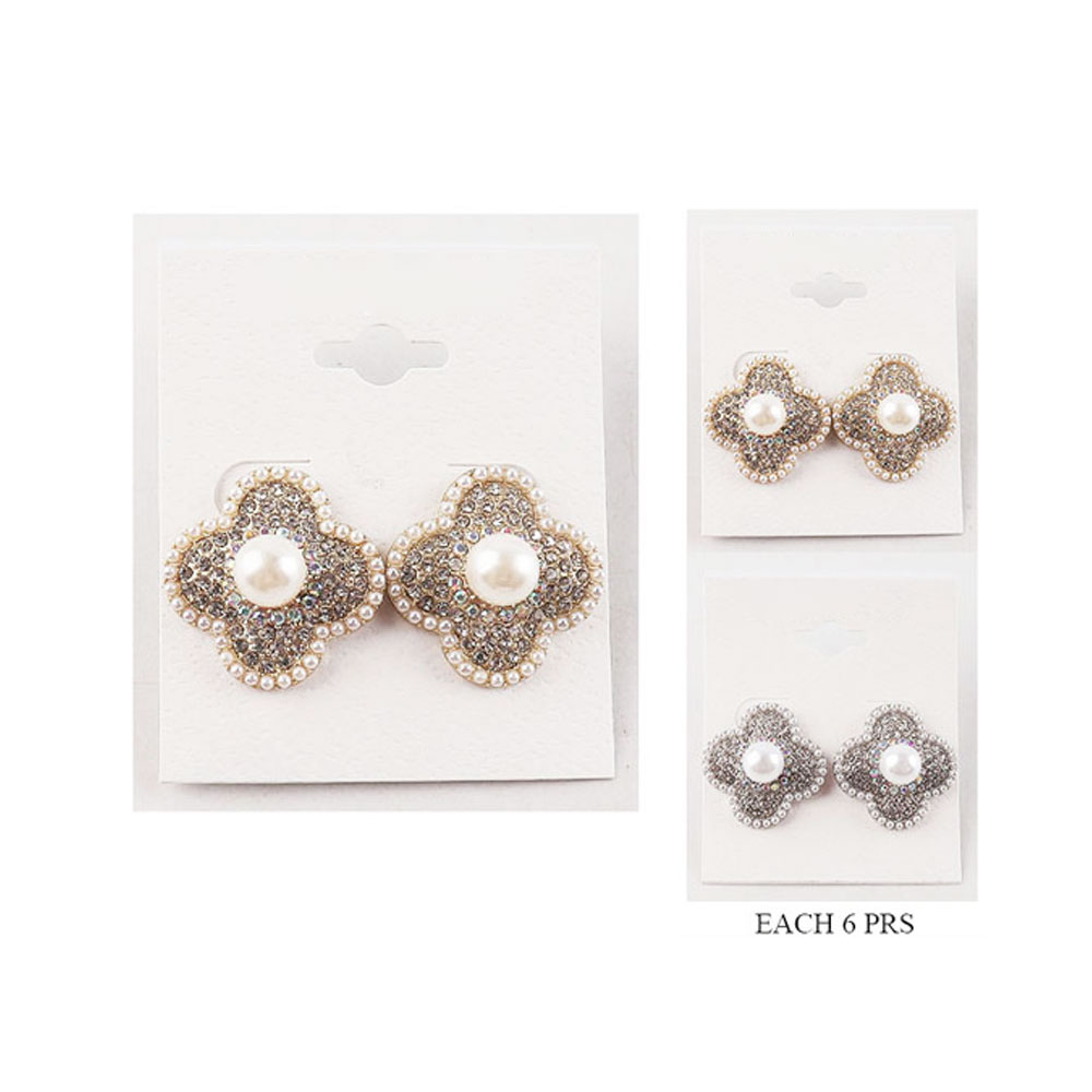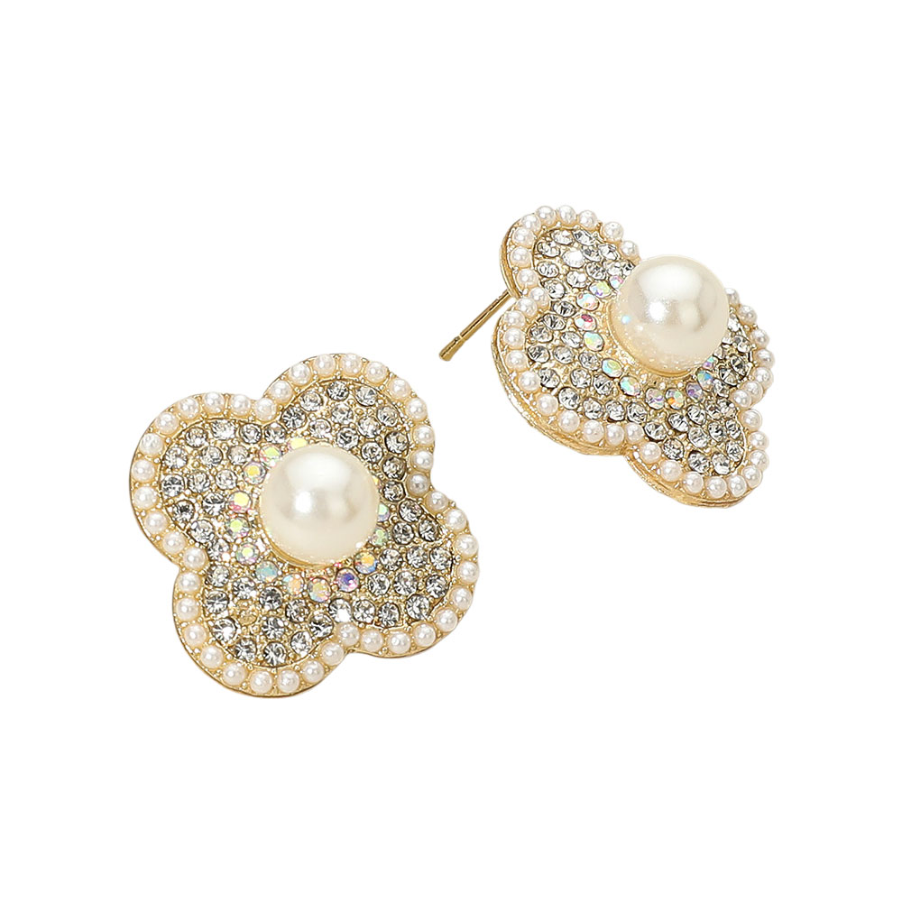 Details • Size : 1" X 1" • Post Back • These pearl center rhinestone quatrefoil stud earrings blend timeless sophistication with radiant sparkle. Featuring a lustrous central pearl surrounded by shimmering crystals and a delicate border, they bring a luxurious touch to any outfit, perfect for elegant and refined styling.