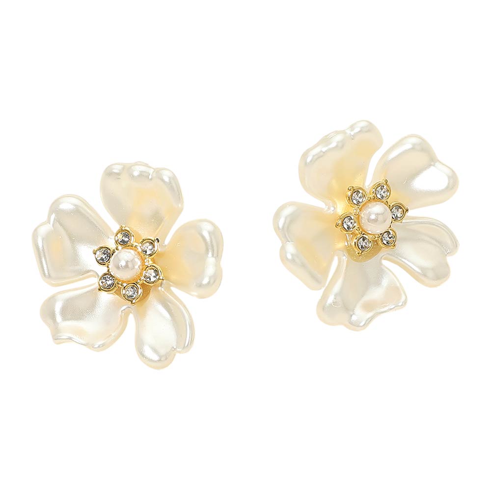 Details • Size : 1.25" X 1.2" • Post Back • These floral stud earrings showcase sculpted petal shapes arranged around a luminous pearl-style center with delicate crystal detailing. Designed for everyday elegance, they add a soft statement to casual outfits while pairing beautifully with dresses and special occasion looks.