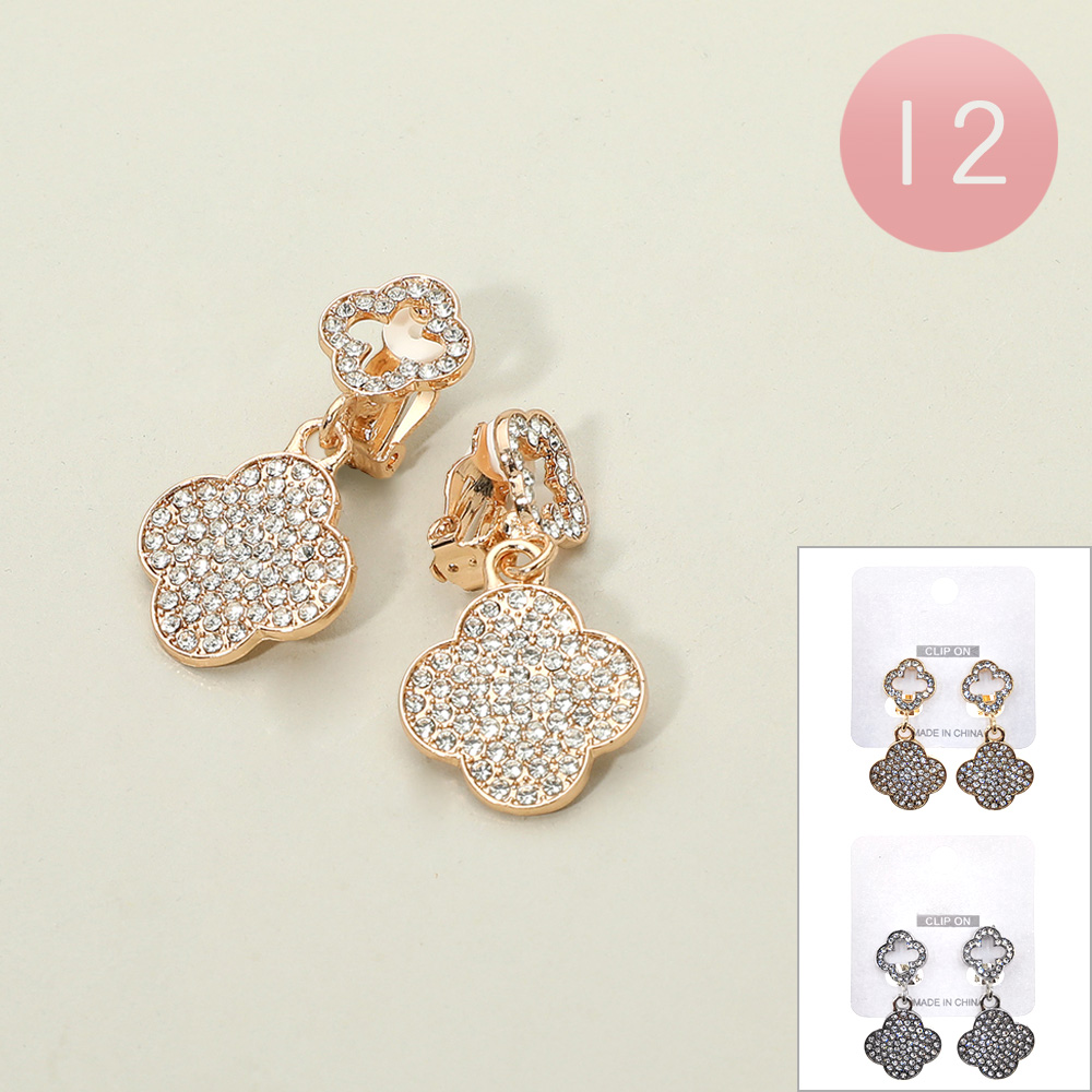 12Pairs - Stone Paved Quatrefoil Dangle Clip On Earrings