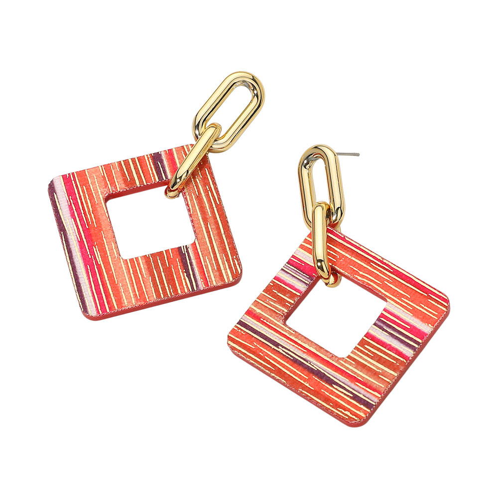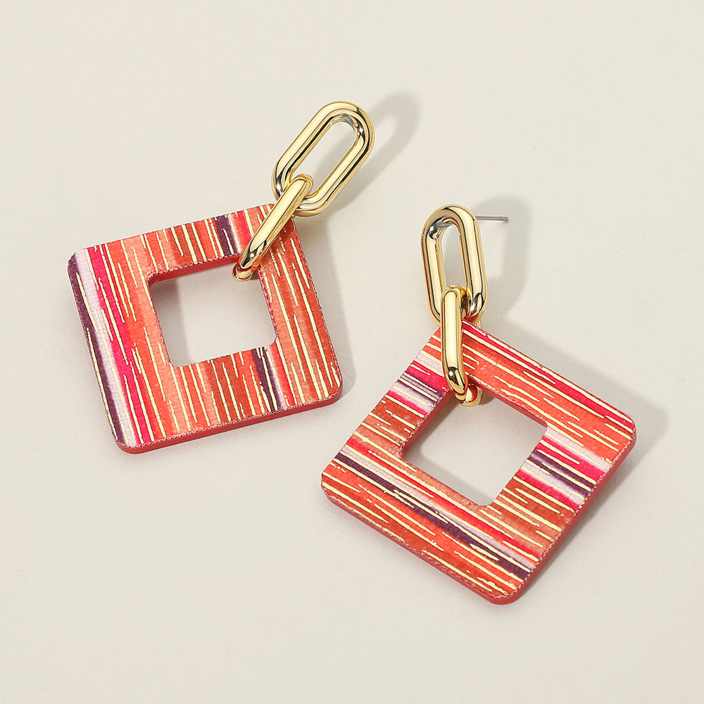 • These striped square link dangle earrings feature a geometric open-square design paired with bold metallic links. Their artistic striped finish adds a playful yet modern flair, making them a standout accessory for elevating both casual and statement fashion looks effortlessly.