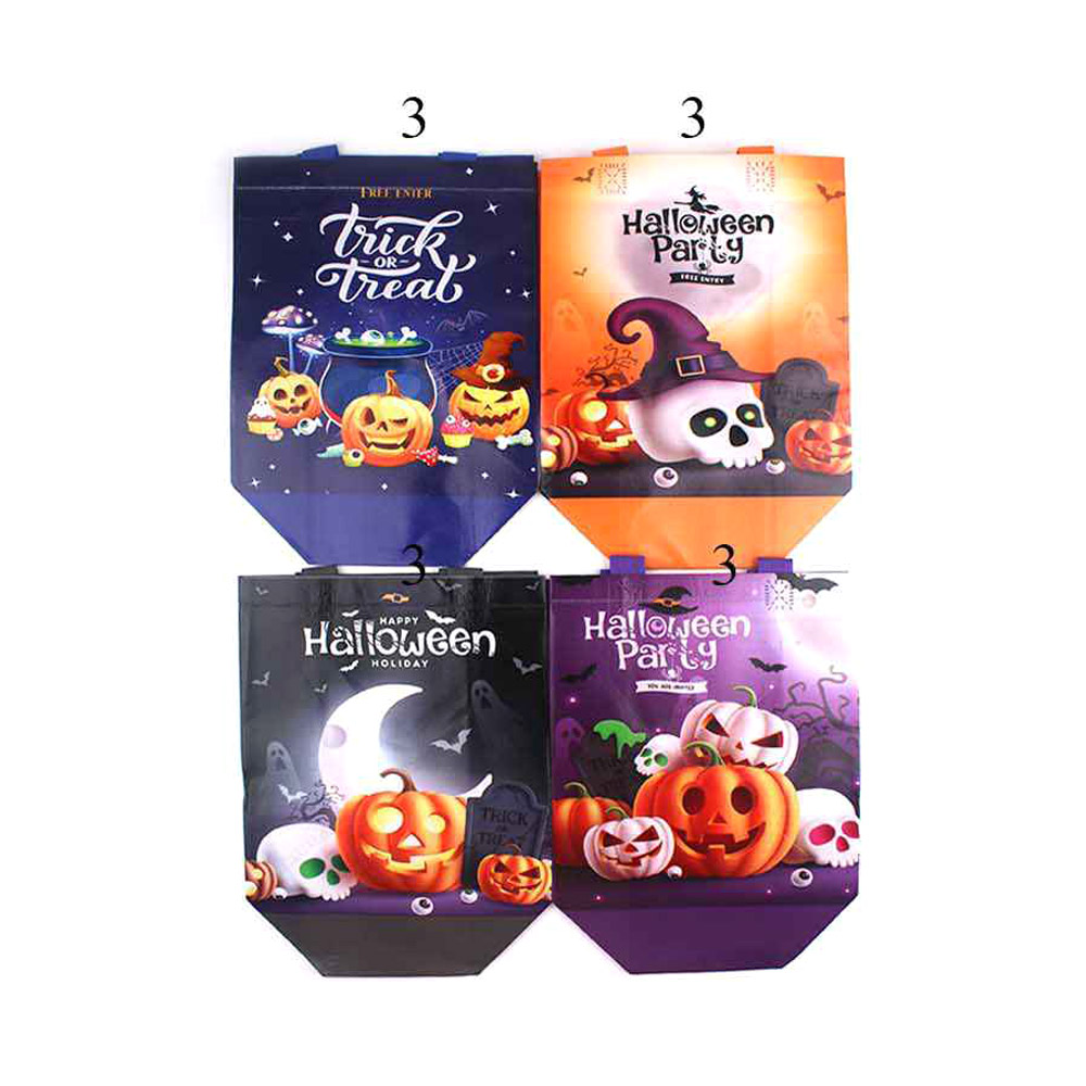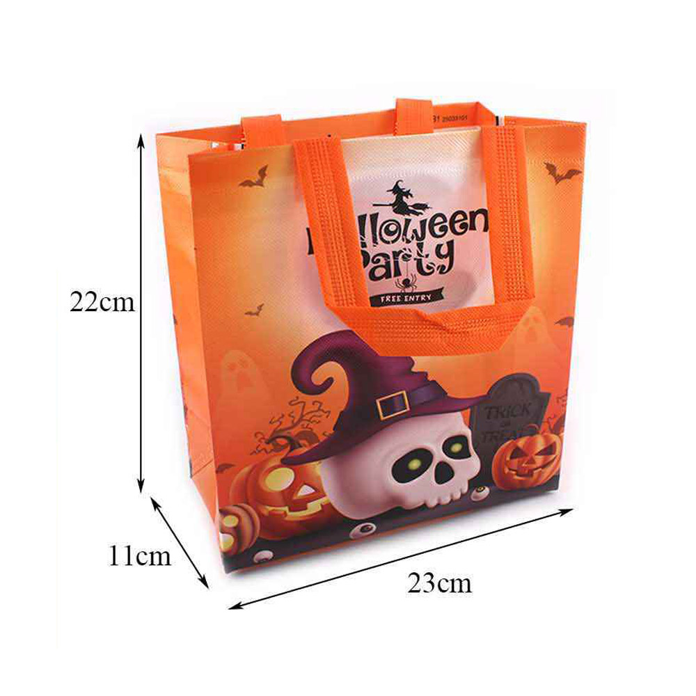 Details • Size : 9" X 8.7" X 4.3" • Top Handle Size : 5" L • Reusable Halloween treat bag with spooky skull and pumpkin design, complete with a witch hat for festive flair. Perfect for carrying candy, toys, and party favors. Strong handles make it ideal for trick-or-treating, school events, or themed parties. A fun and durable accessory for Halloween celebrations.