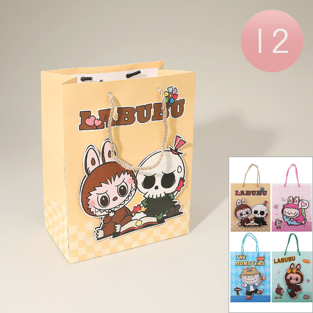 Details • Size : 7" X 9" X 4" • This 12-piece cartoon character printed gift bag set adds a fun and cheerful touch to any occasion. Each bag features colorful character designs and sturdy handles, perfect for party favors, small gifts, or retail packaging. Bright, playful, and reusable, these bags make every gift feel extra special.