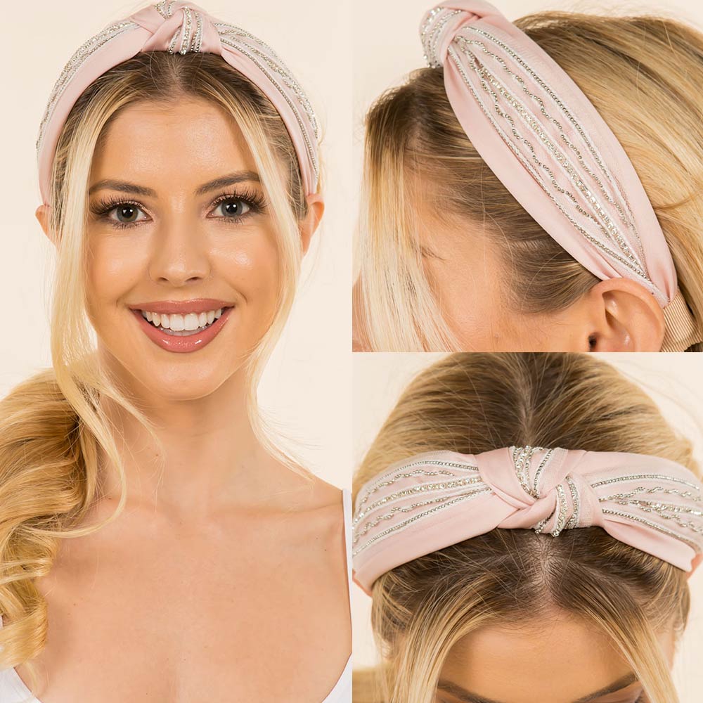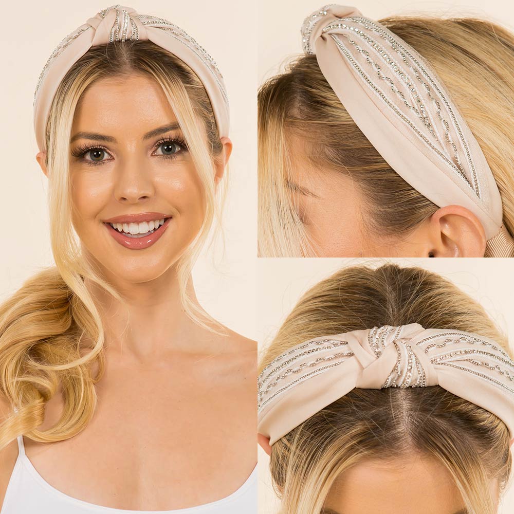 • Statement knot headband designed with sleek striped detailing and subtle rhinestone beads accents for an elevated look. Comfortable wrap style adds polish to everyday outfits, special occasions, or evening wear. Easy to style and wear, making it a versatile hair accessory ideal for gifting and boutique collections.