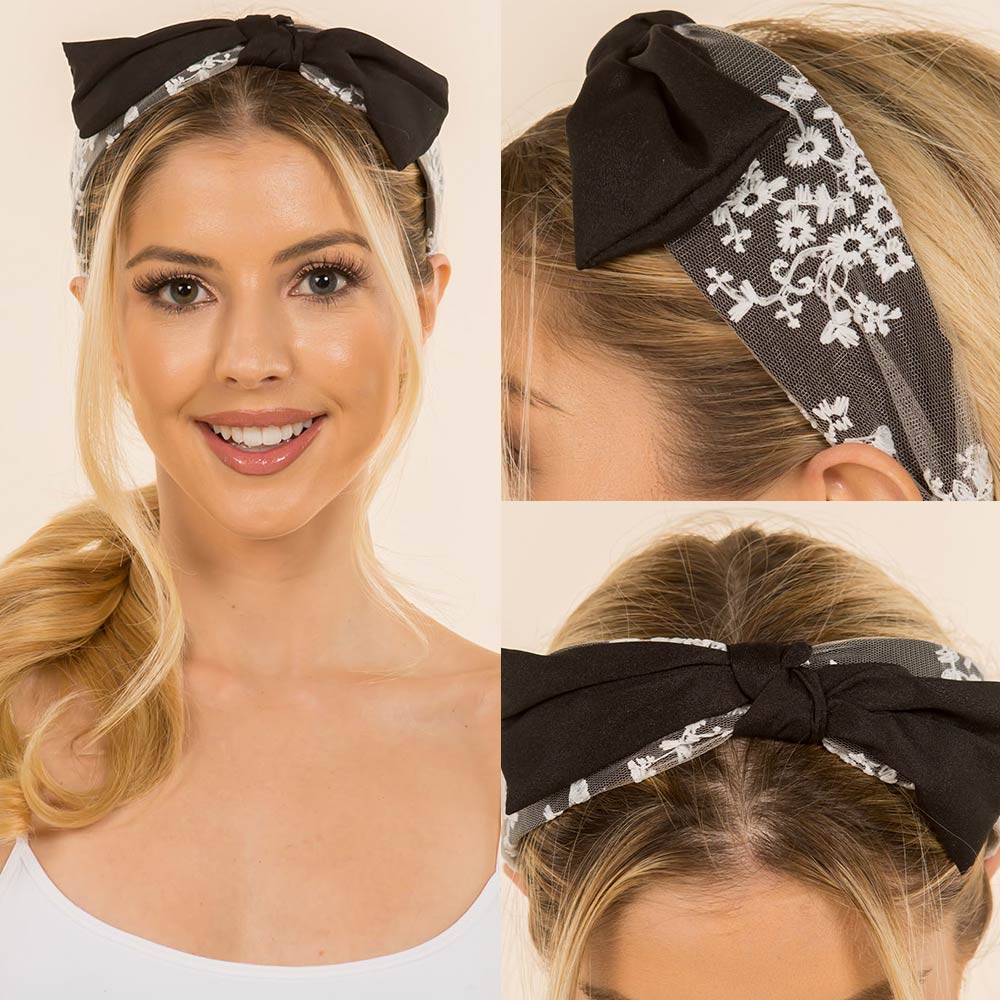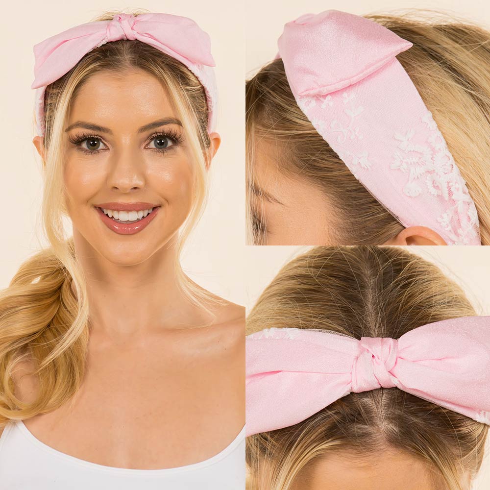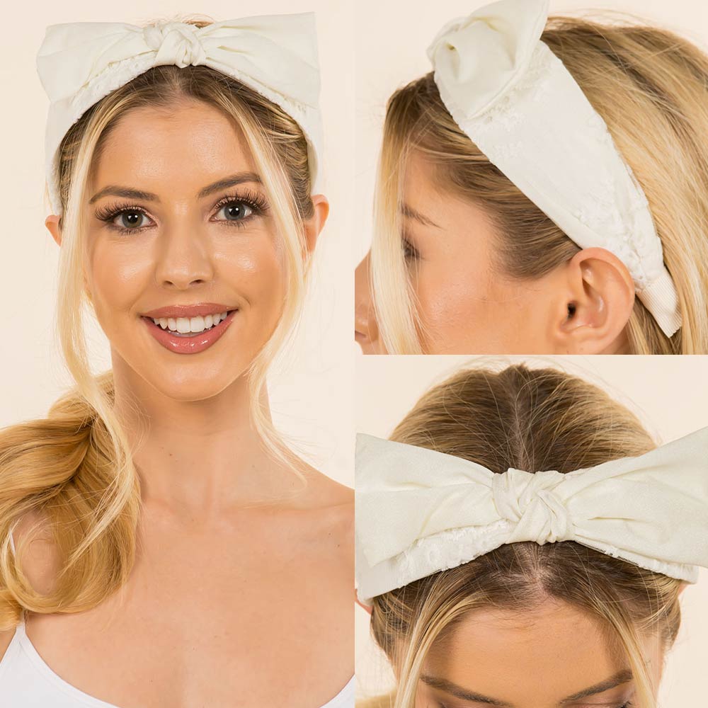 Details • Size : 2.1" H • Embroidered bow knot headband designed with delicate stitched detailing and a soft, comfortable wrap fit. Adds a feminine, polished touch to everyday outfits, travel looks, or special occasions. Easy to style and wear, making it a versatile hair accessory for gifting and boutique collections.