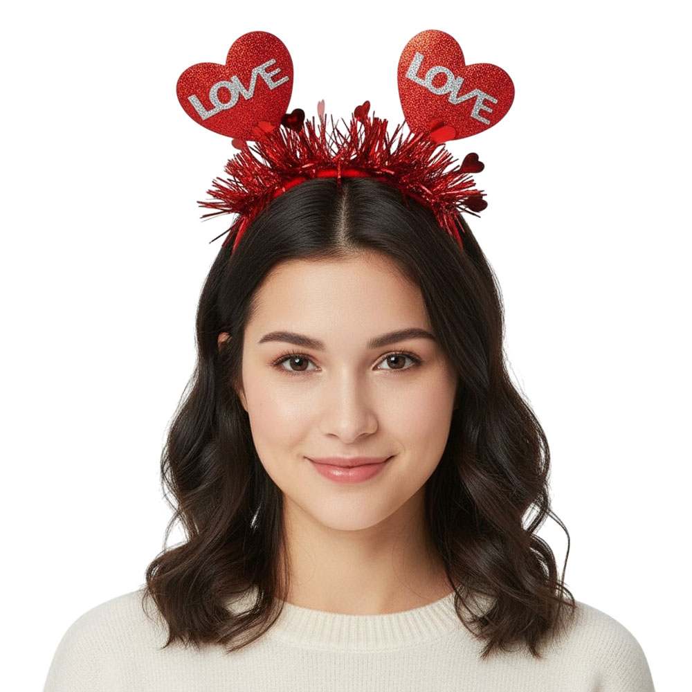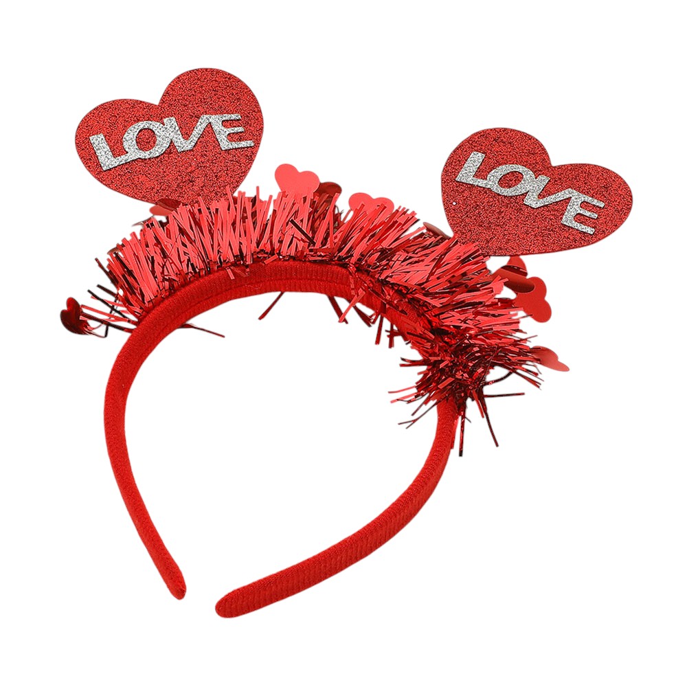 Details • Size : 3.75" H • A fun heart-themed headband designed with playful love accents and festive tinsel details, perfect for parties, themed events, holidays, and photo moments. Lightweight and comfortable to wear, it adds a cheerful touch to costumes, celebrations, and special occasions with effortless style.