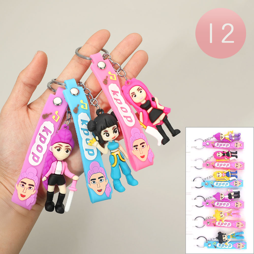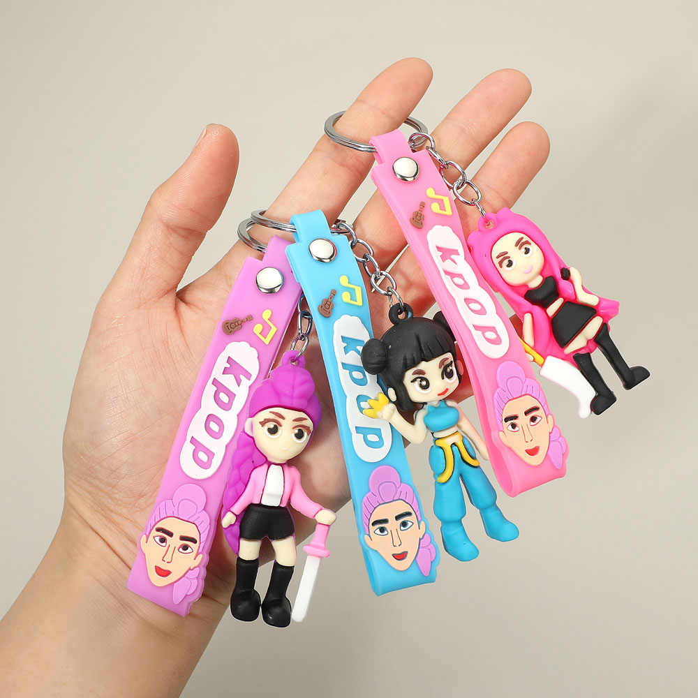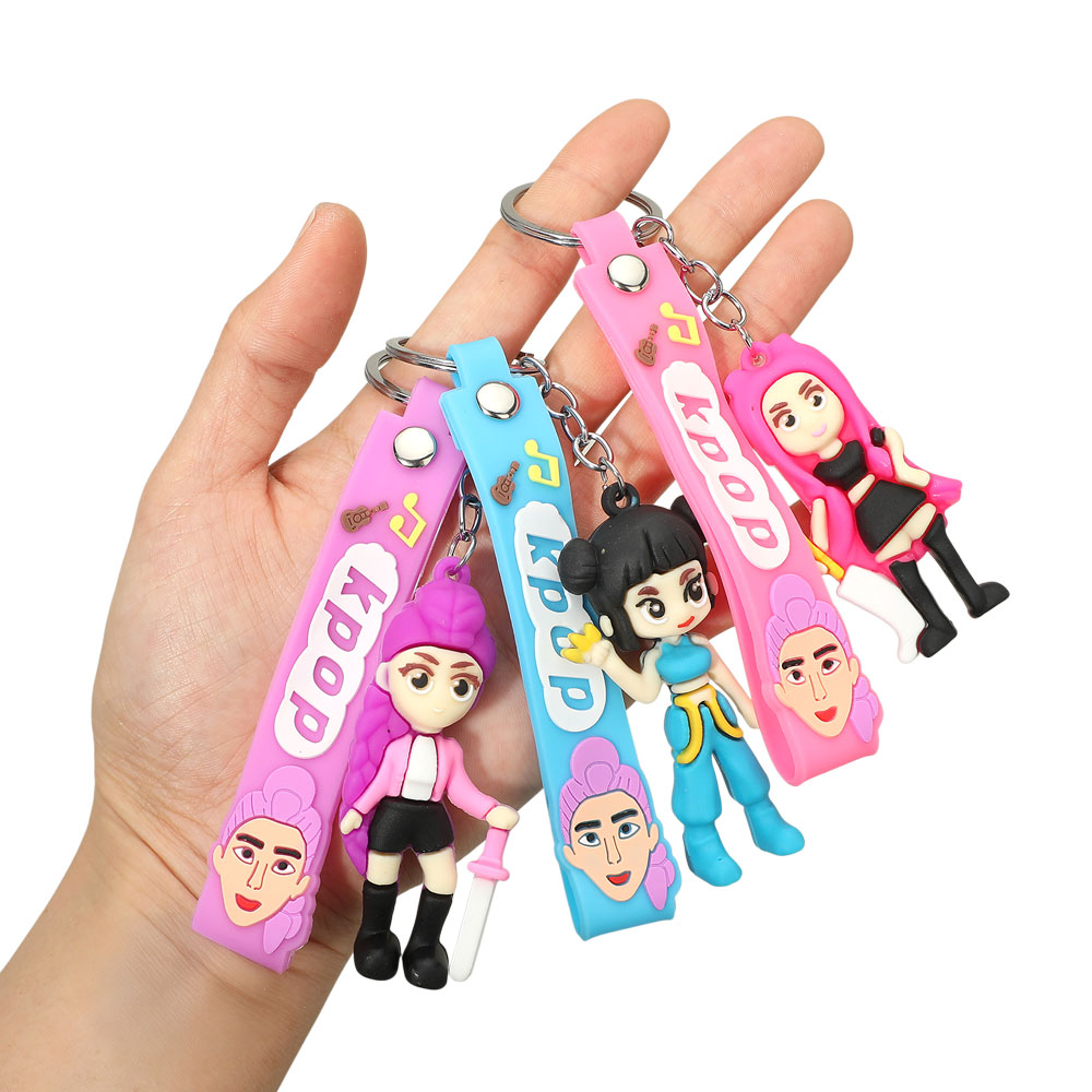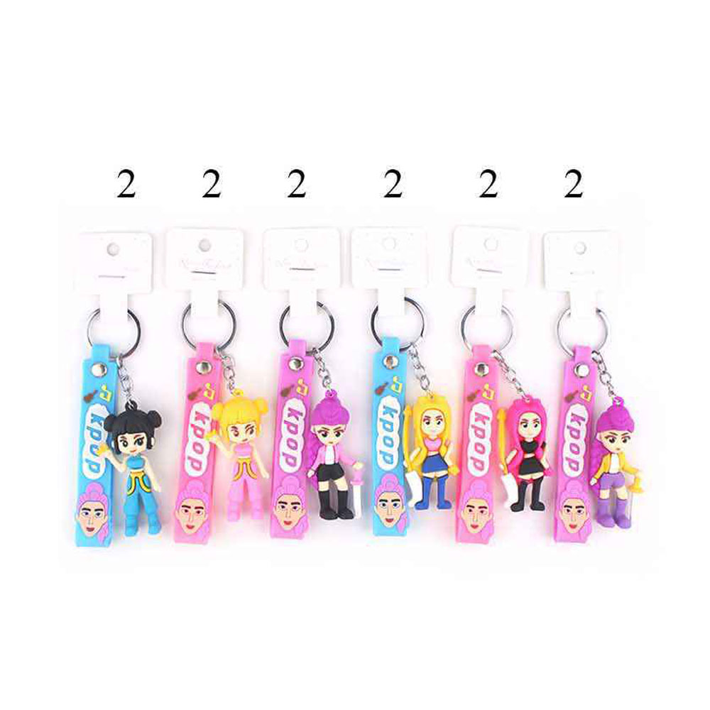 Details • Size : 5.25" L, 1.4" X 2.8" • K-pop demon hunters character figure keychain featuring playful cartoon-style idols with flexible straps and dangling figure details. Designed for easy attachment to keys, bags, or backpacks, this novelty accessory is ideal for fan merchandise, gift displays, trend-driven assortments, and pop culture–inspired retail collections.