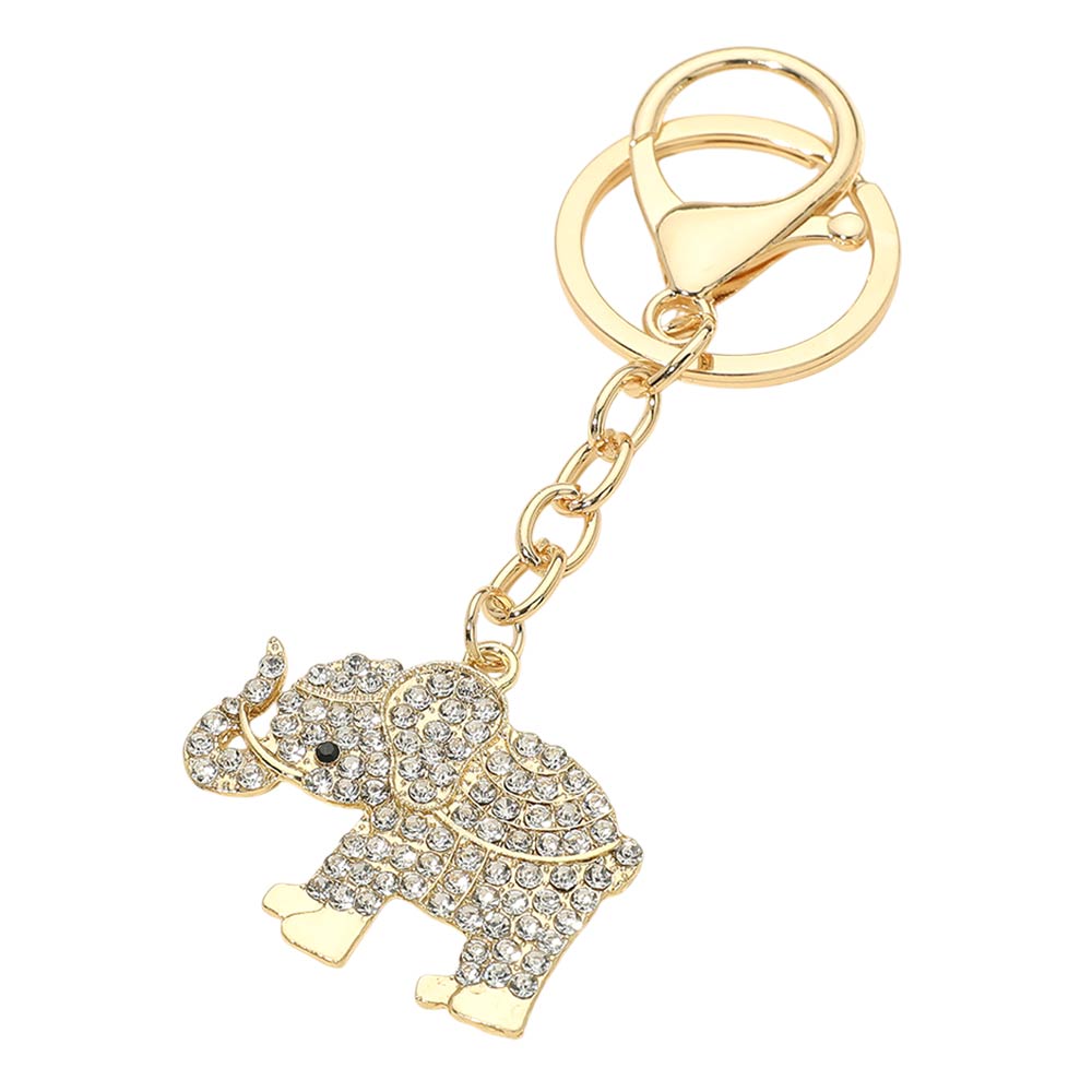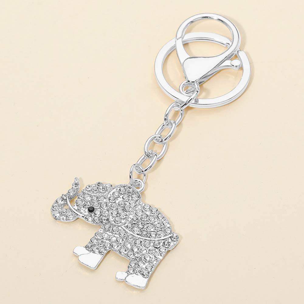 Details • Size : 3.6" L, 1.75" X 2.6" • Elephant charm keychain featuring full rhinestone detailing with a playful, eye-catching silhouette. Designed with a secure keyring and lobster clasp for easy attachment to keys, handbags, or backpacks. A charming accessory ideal for gifting, boutique displays, party favors, and everyday decorative use.
