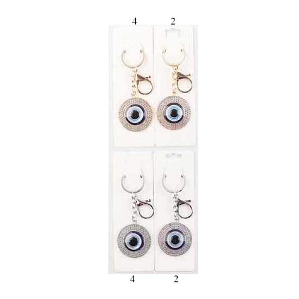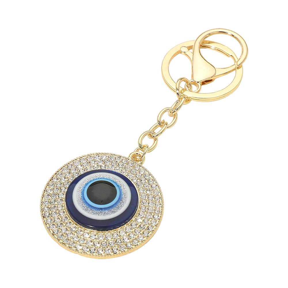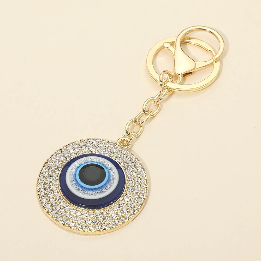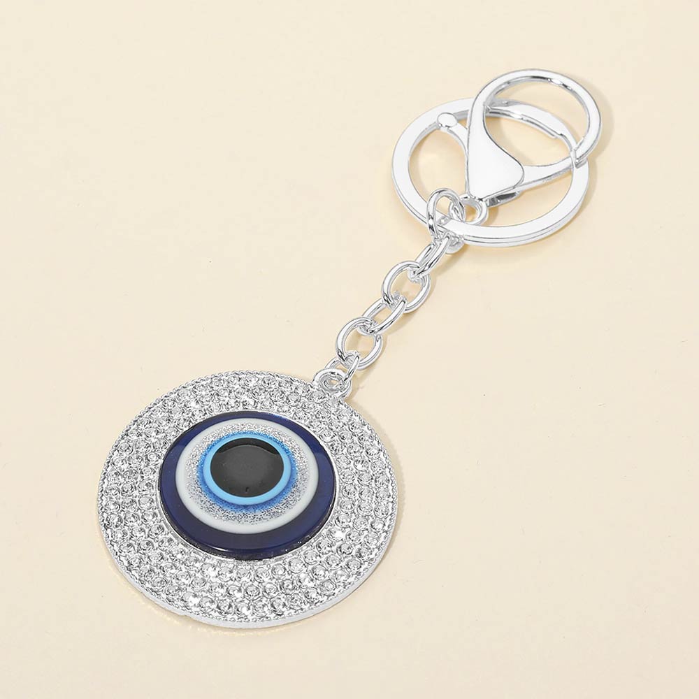 Details • Size : 4.2" L, 1.75" X 3.2" • Evil eye charm keychain designed with a circular rhinestone frame and symbolic center motif. Features a sturdy keyring and lobster clasp for easy attachment to keys, handbags, or backpacks. Ideal for everyday carry, gifting, boutique displays, party favors, and protective-symbol themed accessory collections.
