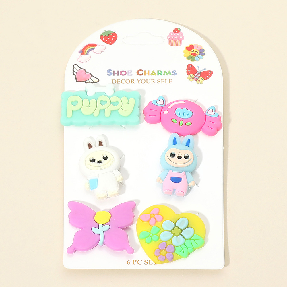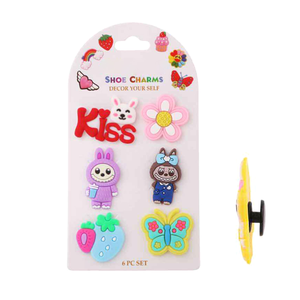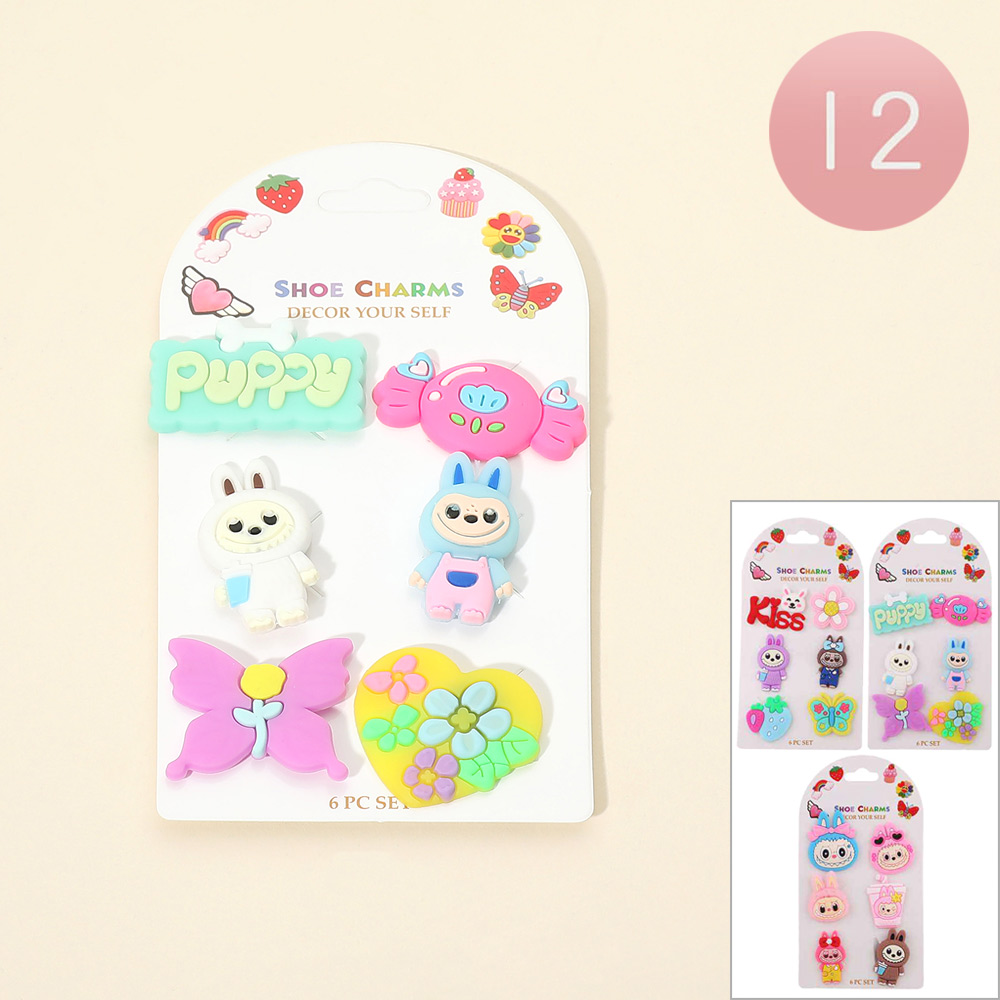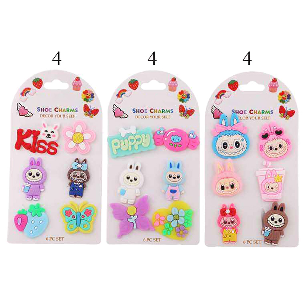 Details • Size : 0.75" - 1.5" L • Playful shoe charm set featuring cute character and fun decorative designs in a 6 piece assortment. Easy to attach and perfect for personalizing footwear, party favors, gift shops, kids accessories, and everyday fun displays that encourage creativity and self-expression.