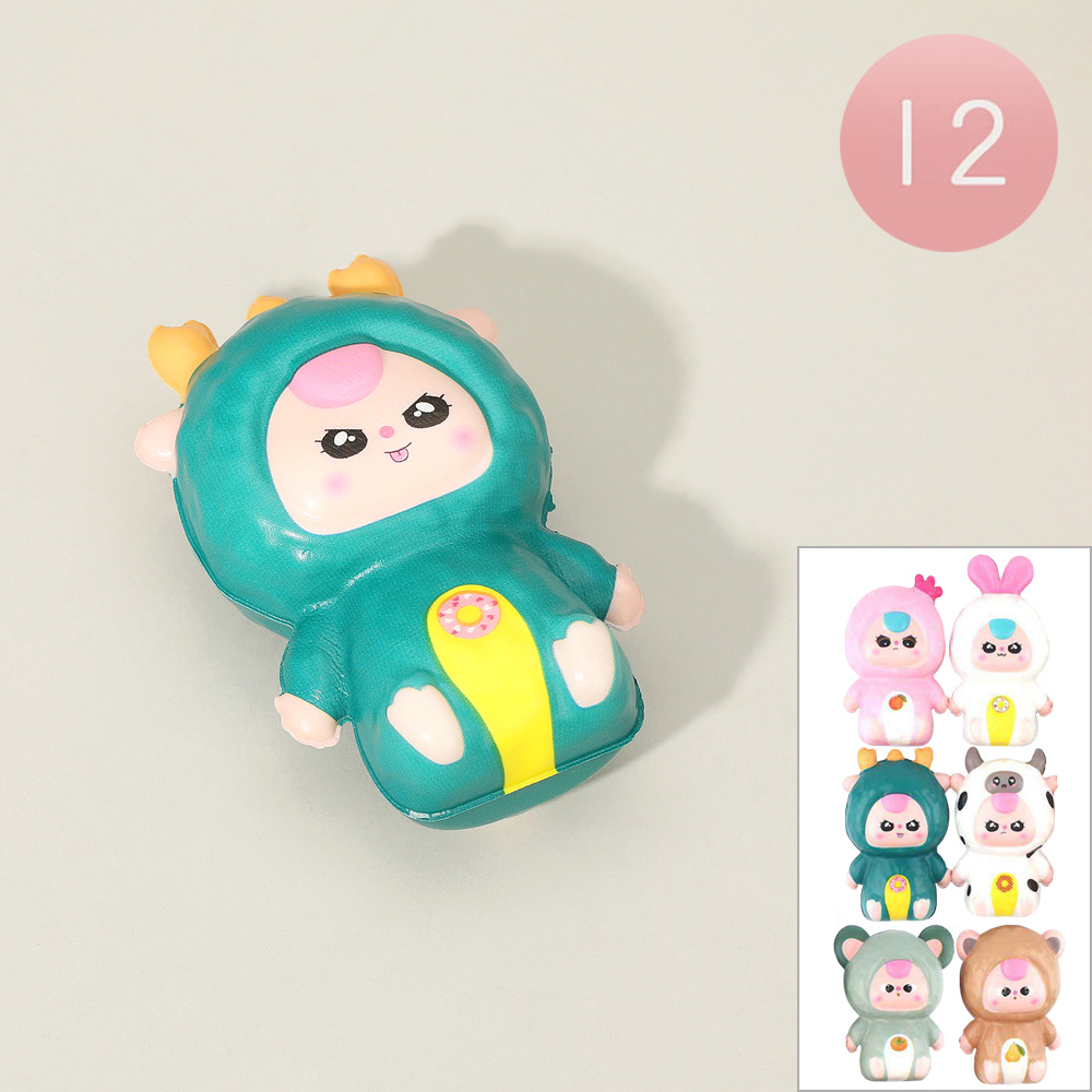 Details • Size : 4" L • Cute squishy toy set featuring 12 animal-themed characters with playful costumes and charming expressions. Soft, slow-rising design makes them perfect for stress relief, party favors, or gifts. Great collectible toys that bring fun and relaxation for kids and adults alike.