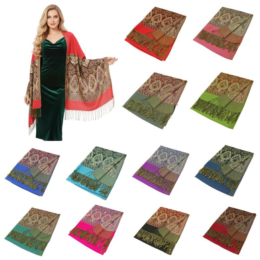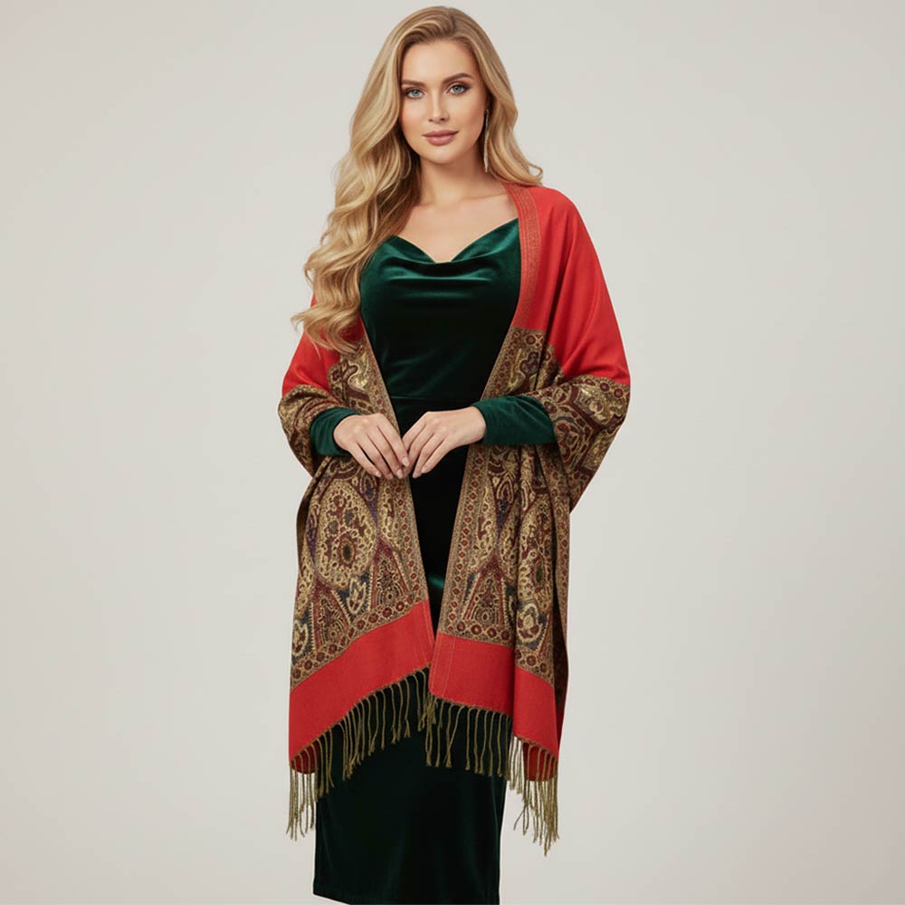 Details • Size : 27.5" X 76" • Fringe Size : 3.3" L • This fashion wrap scarf features an ornate paisley-inspired border with flowing fringe edges for an elevated, boutique-ready look. Designed for versatile draping and statement styling, it complements dresses and casual outfits while fitting well into seasonal collections, gift assortments, and curated accessory displays.