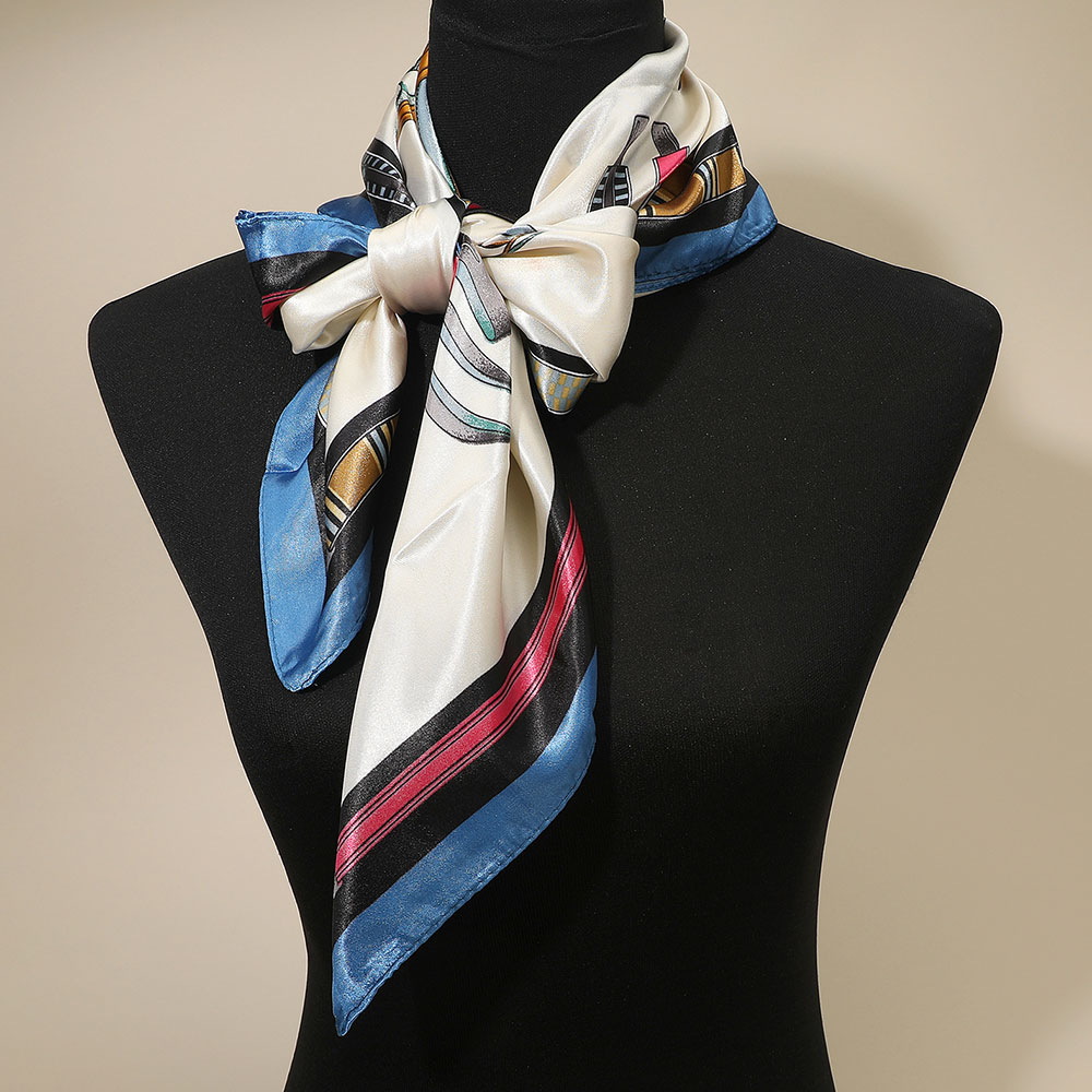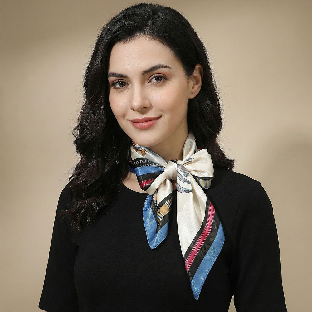 • An elegant square scarf featuring intricate graphic motifs for a refined finishing touch. Ideal for styling around the neck, on handbags, or in the hair, this versatile accessory adds polish and personality to everyday looks or special occasions.