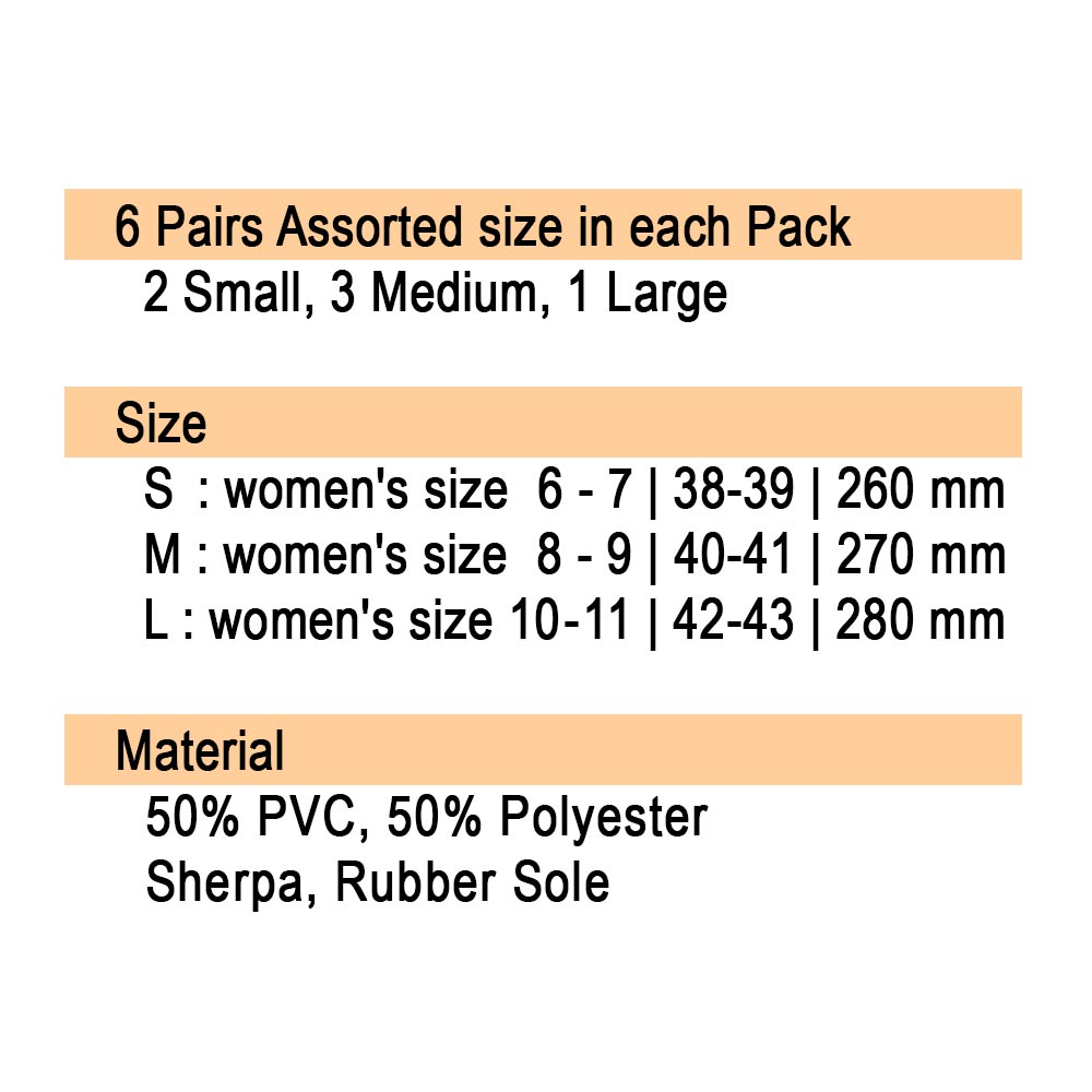 Details • Size : 6 Pairs Assorted size in each pack • 2 Small, 3 Medium, 1 Large • S: women size 6-7 (260 mm) 38-39 • M: women size 8-9 (270mm) 40-41 • L: women size 10-11 (280mm) 42-43 • Material: 50% PVC, 50% Polyester • Elevate your lounge style with these fleece-lined indoor slippers adorned with sparkling rhinestones. Designed for warmth, comfort, and a snug fit, they add a touch of glamour to your at-home relaxation. Ideal for self-care days, chilly mornings, or thoughtful holiday gifting.