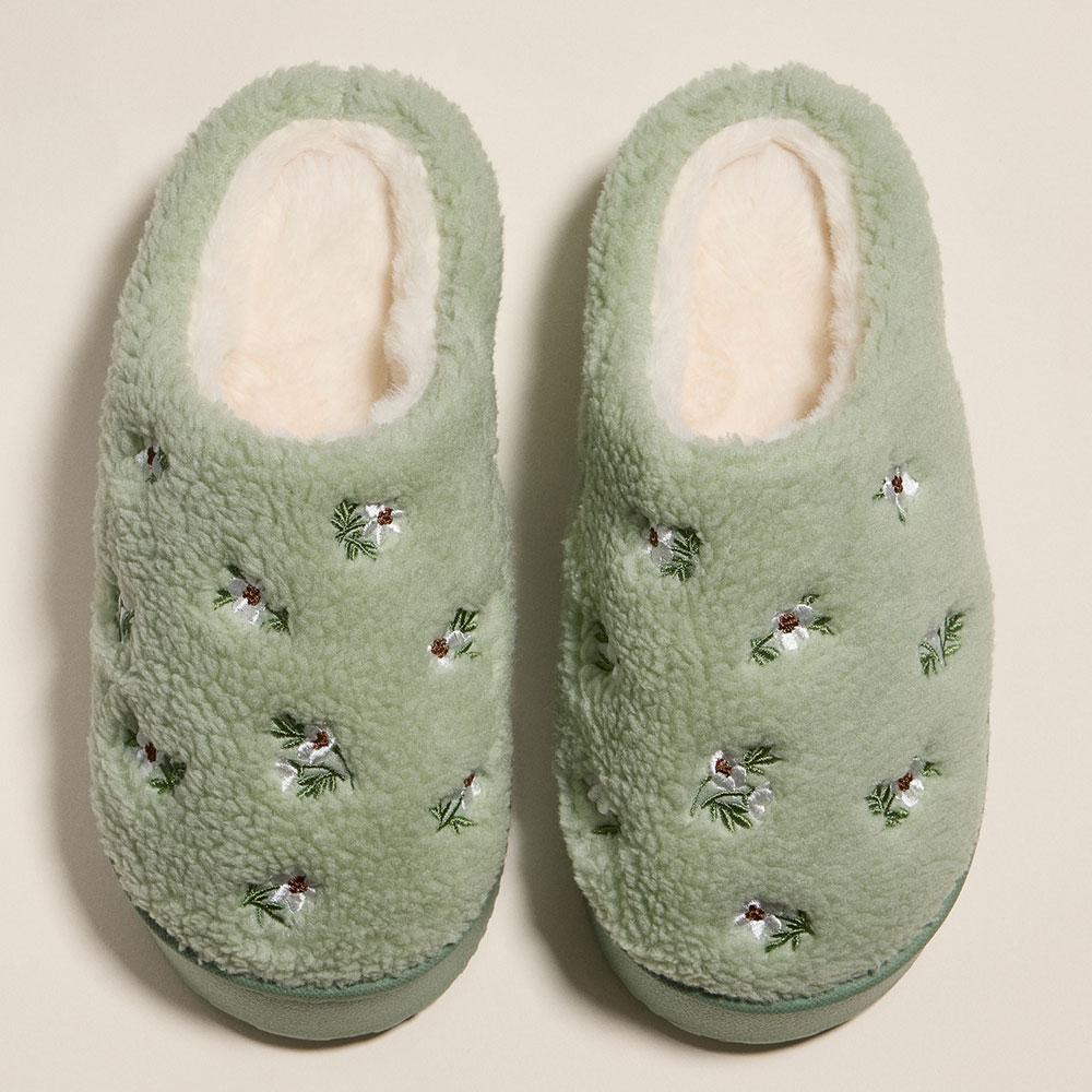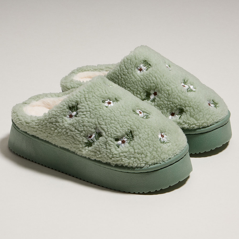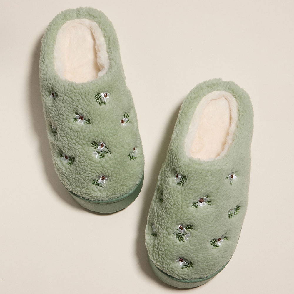 • Step into comfort with these sherpa-lined slippers featuring delicate floral embroidery. Perfect for lounging at home, they offer plush warmth and a charming cottagecore vibe all season long.