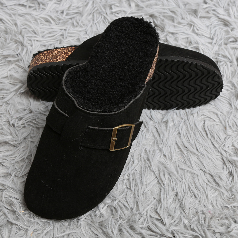 Solid Faux Fur Suede Buckle Mule Clog Slippers
