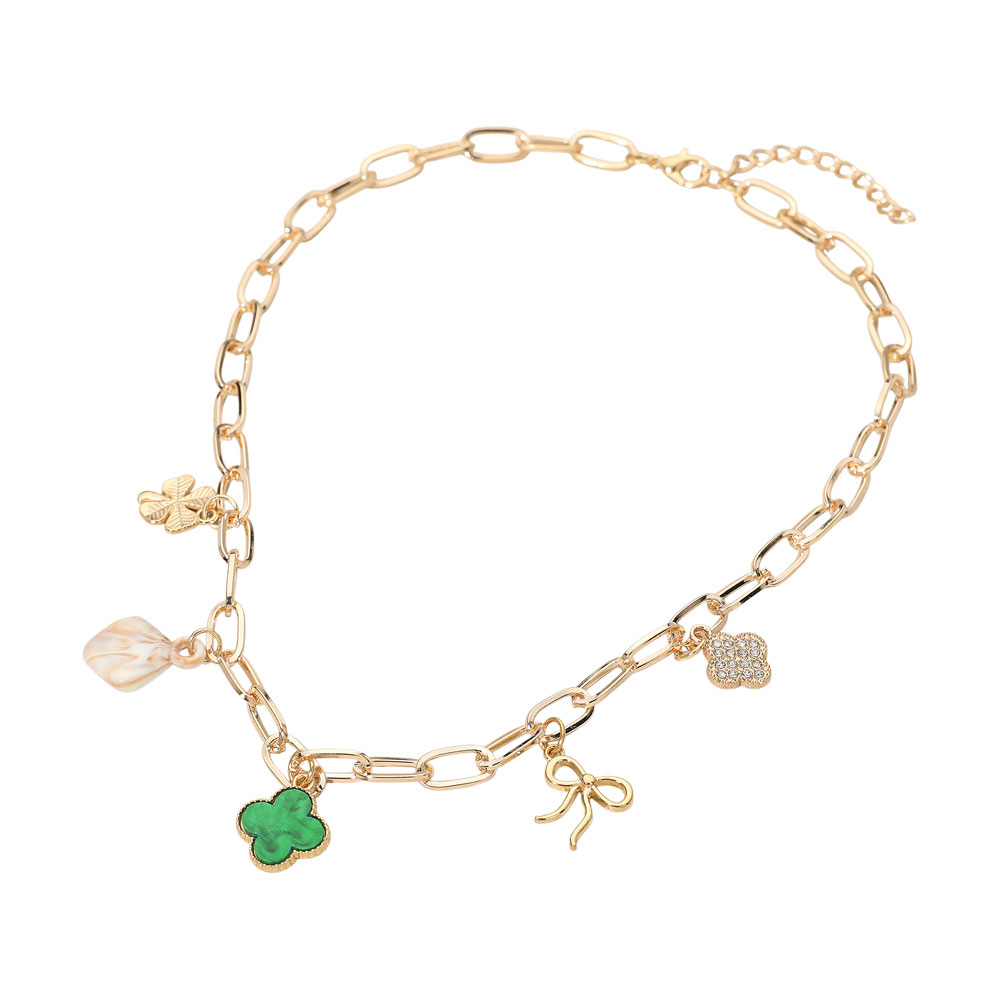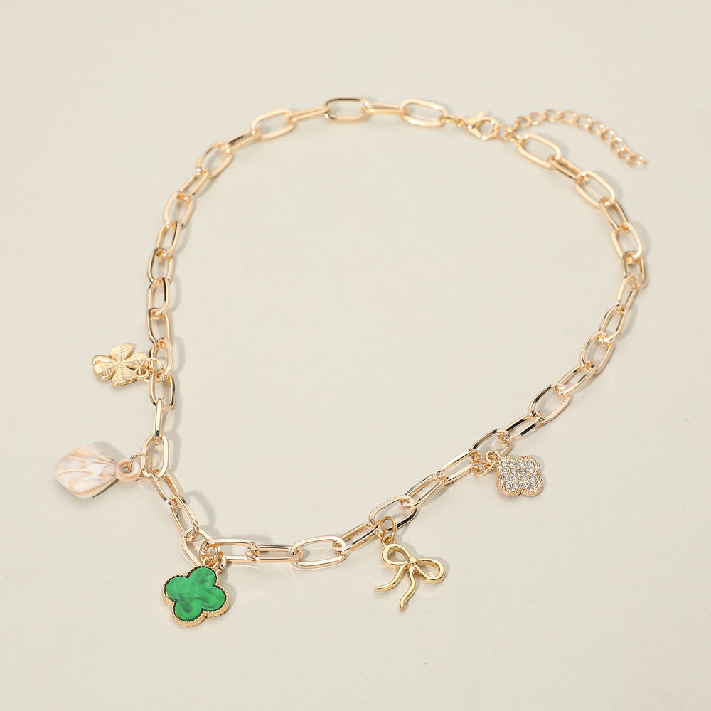 • This delicate chain necklace features a beautiful mix of charms including a clover, bow, and crystal accent for a touch of playful sophistication. Designed with adjustable links for a perfect fit, it adds a stylish and feminine finish to both everyday looks and special occasion outfits.