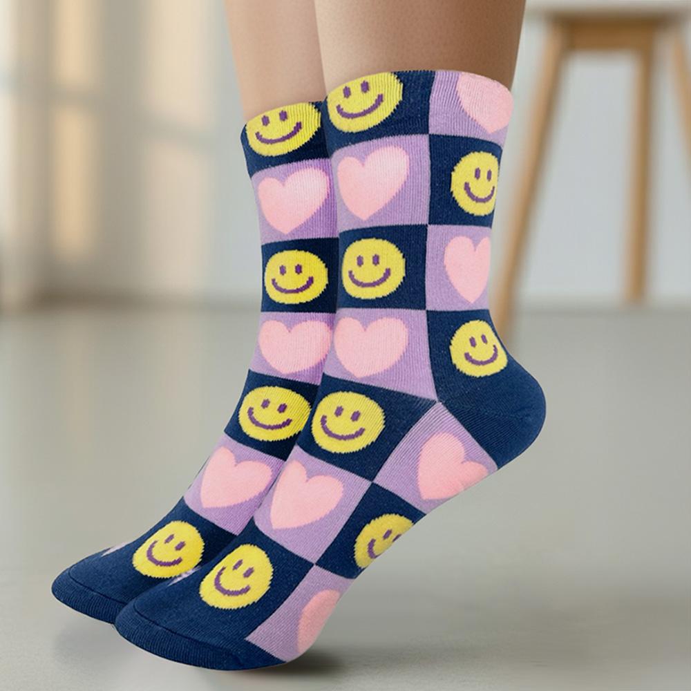 • Pack of fun pattern socks featuring playful smiley and heart designs for a cheerful everyday accessory. Soft and comfy, these socks add a touch of joy to casual outfits and make a perfect gift or colorful addition to any sock collection.