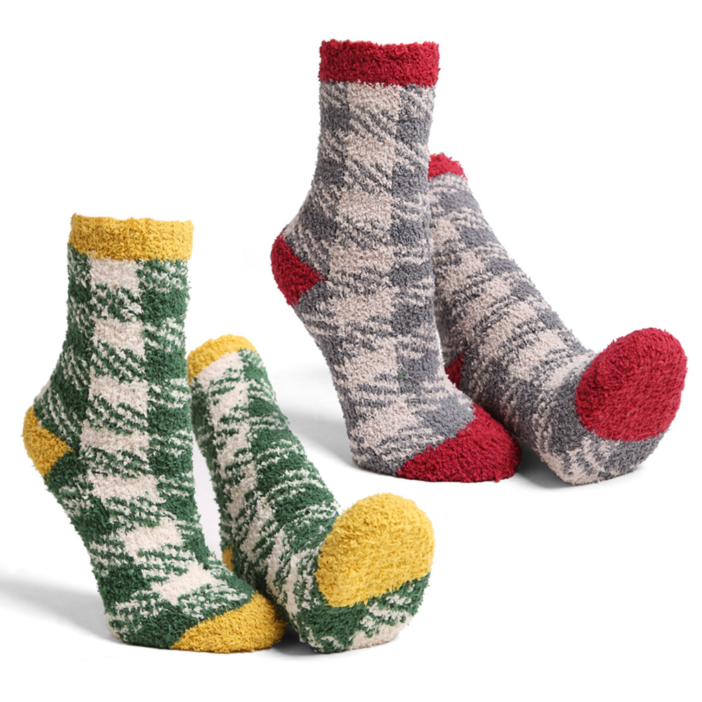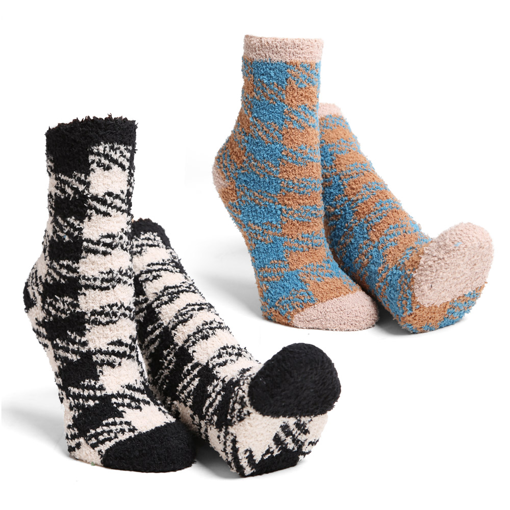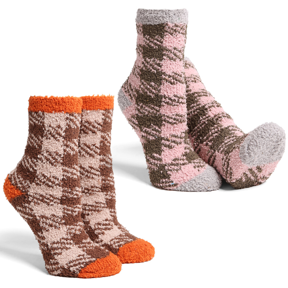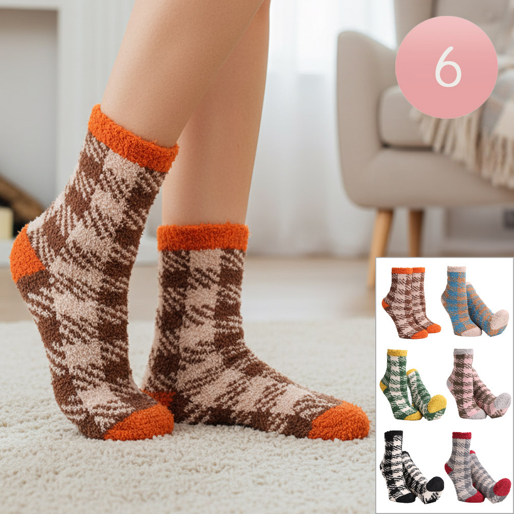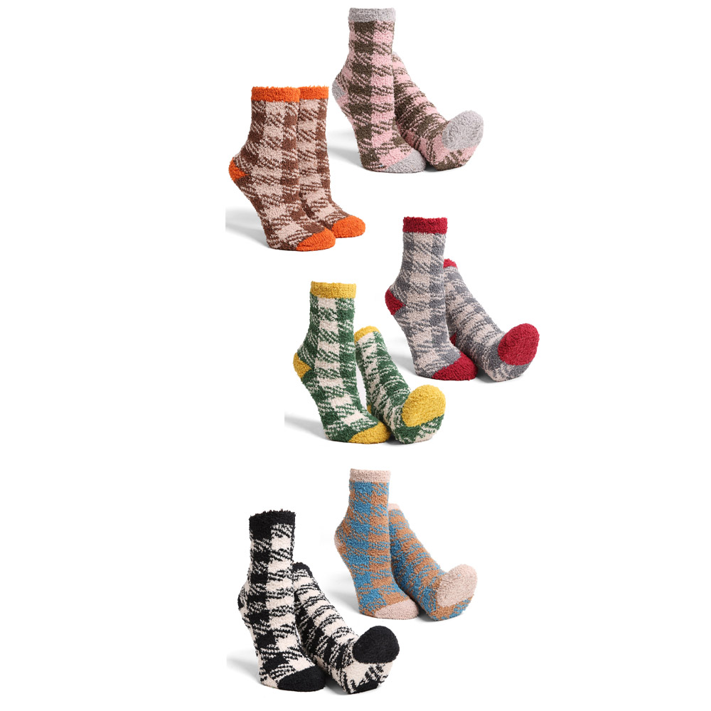 Details • Size : 9 - 11 • Material : 100% Poly. Microfiber • Soft and warm fuzzy socks set featuring stylish plaid patterns and comfy stretch fit. Perfect for lounging at home or keeping feet cozy in cold weather. Plush, breathable, and cute — ideal for gifting or adding comfort and charm to everyday wear.