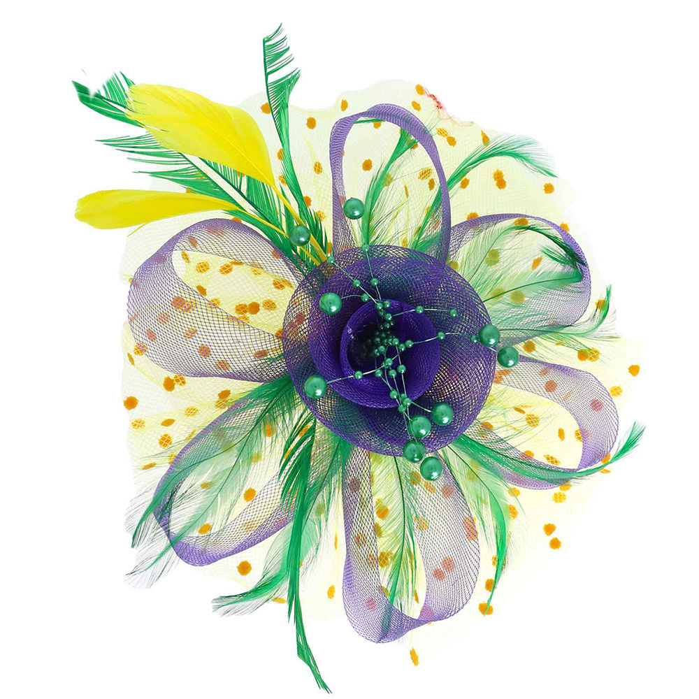 Details • Size : 7" X 8" • Dual : Hair Pinch Clip / Headband • Turn heads with this vibrant feather and mesh mardi gras theme flower fascinator hair clip. Designed with layered loops, delicate feathers, and beaded accents, it adds a touch of elegance and playful flair to any special occasion or festive ensemble.