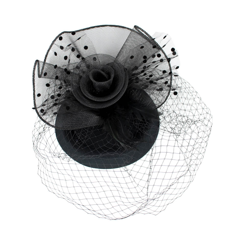 • Chic black fascinator hat featuring a delicate mesh veil, floral centerpiece, and dotted netting. Perfect for weddings, tea parties, races, or formal events, this headpiece adds timeless sophistication and classic charm.