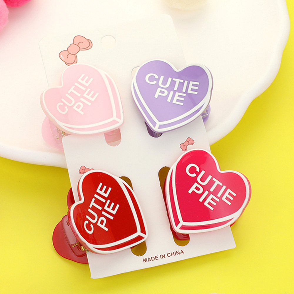 Details • Size : 1.5" X 1.6" • Charming heart-shaped hair claw clips featuring a playful “Cutie Pie” message, designed to add a sweet, fun accent to everyday hairstyles. Easy to clip and comfortable to wear, they are perfect for securing bangs or half-up looks and work well for gifting, seasonal assortments, and trend-driven accessory displays.