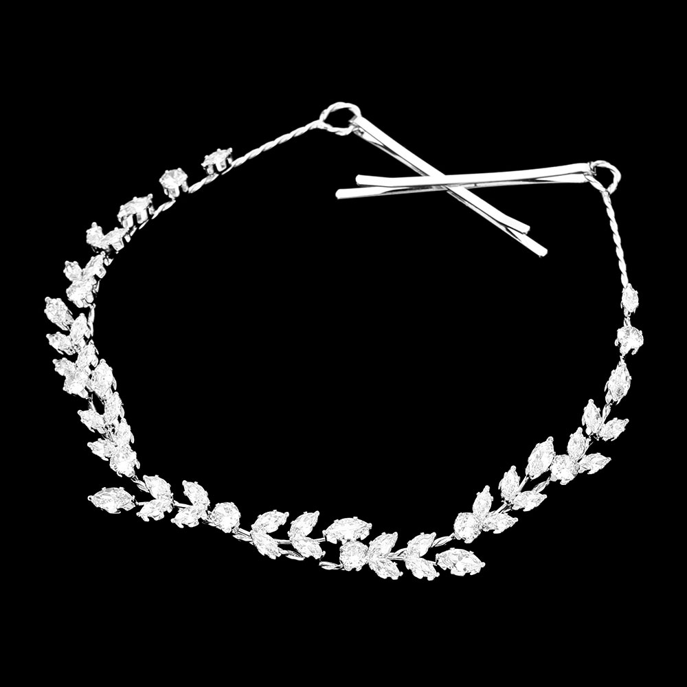 Details • Size : 11" X 0.4" • A Pair Bobbi Pin Included • Sparkling bridal hair halo designed with delicate crystal leaves on a flexible vine base. Perfect for weddings, proms, and special occasions, this elegant headpiece adds refined sparkle to updos and flowing hairstyles. • CZ Cubic Zirconia