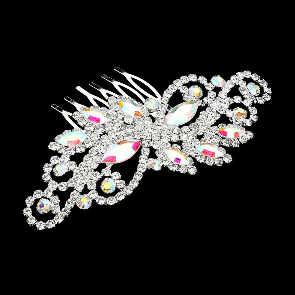 • Rhinestone leaf bridal hair comb with marquise and round crystals in a delicate floral design. Perfect for weddings, proms, and formal occasions, this sparkling accessory enhances elegant updos with timeless charm.