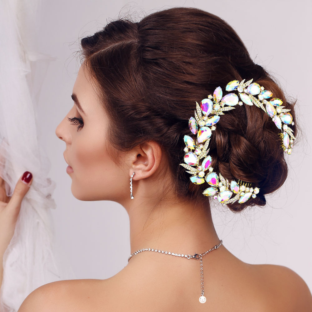 Details • Size : 11" X 1.25" • Complete your bridal look with this circular crystal hairpiece, designed with bold leaf and vine accents for a glamorous finish. Perfect for securing elegant updos, this sparkling accessory adds timeless charm to weddings, proms, and formal occasions.