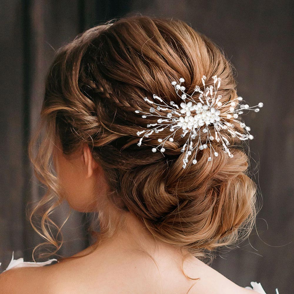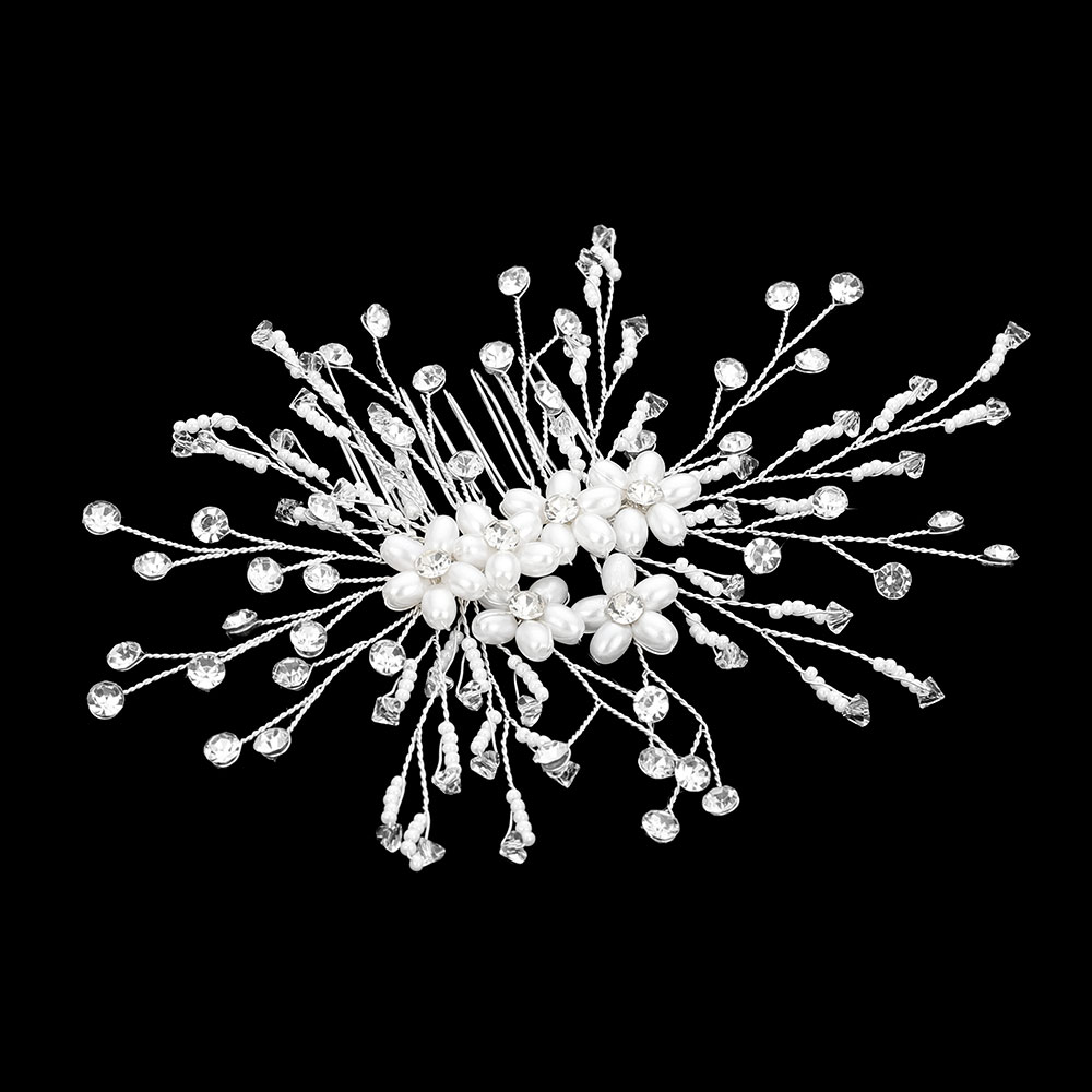 Details • Size : 6" X 4" • Illuminate your hairstyle with this radiant pearl and crystal floral hair comb. Designed with delicate blossoms and sparkling accents, it adds a touch of glamour to weddings, proms, and elegant events. Perfect for brides seeking a timeless, graceful, and refined finishing touch. • Lead and Nickel Compliant