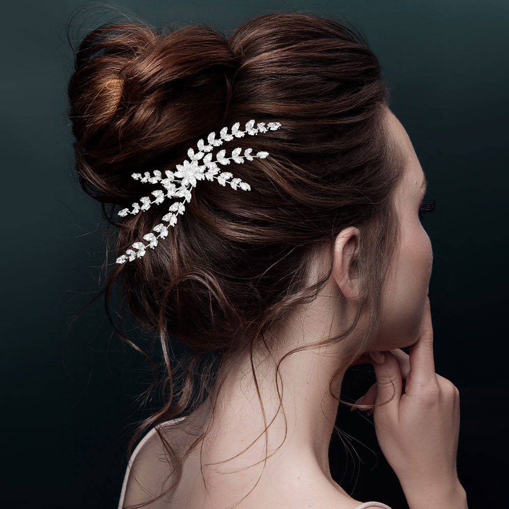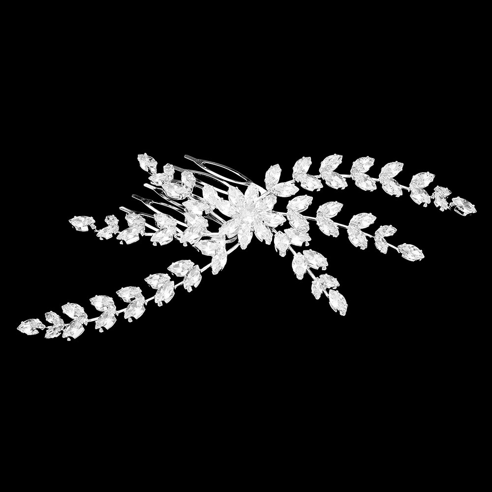 Details • Size : 5.5" X 3" • Enhance your hairstyle with this graceful cz crystal vine hair comb featuring shimmering leaf-shaped stones arranged in a flowing, nature-inspired design. Lightweight and secure, it adds refined sparkle to bridal looks, formal events, or any occasion that calls for a touch of radiant elegance. • CZ Cubic Zirconia • Lead and Nickel Compliant