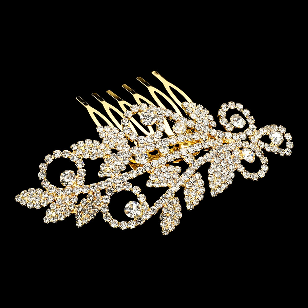 • Rhinestone floral bridal hair comb with intricate leaf and swirl design, sparkling with brilliance. Perfect for weddings, proms, and formal events, this elegant accessory enhances any updo with timeless beauty.