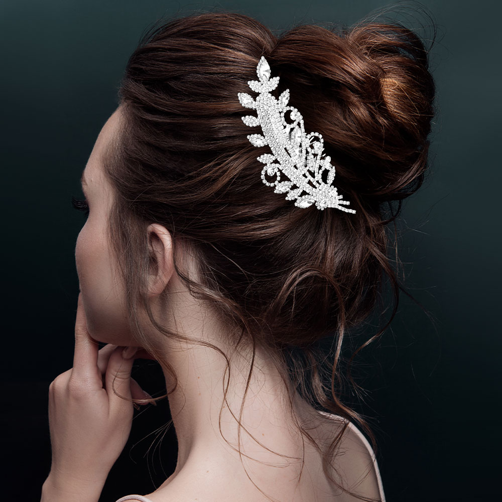 • Illuminate your hairstyle with this rhinestone leaf hair comb featuring intricate curves and brilliant stone detailing. Its elegant, lightweight design adds refined sparkle, making it a perfect accessory for weddings, formal events, or elevating everyday looks with graceful shimmer.