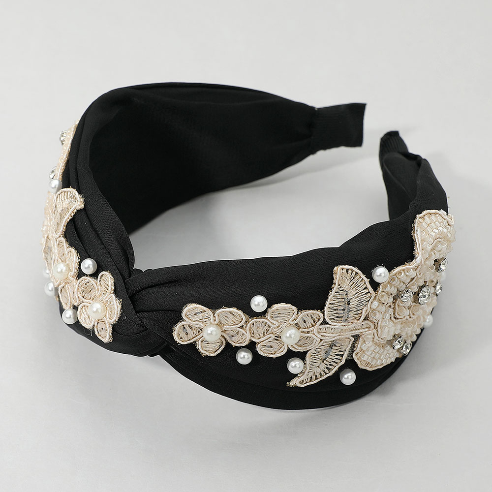 Details • Size : 3" H • This elegant headband features delicate floral embroidery accented with pearls and crystals, creating a refined and feminine look. Designed with a soft knotted style, it adds a touch of sophistication to any outfit—perfect for special occasions or everyday elegance.