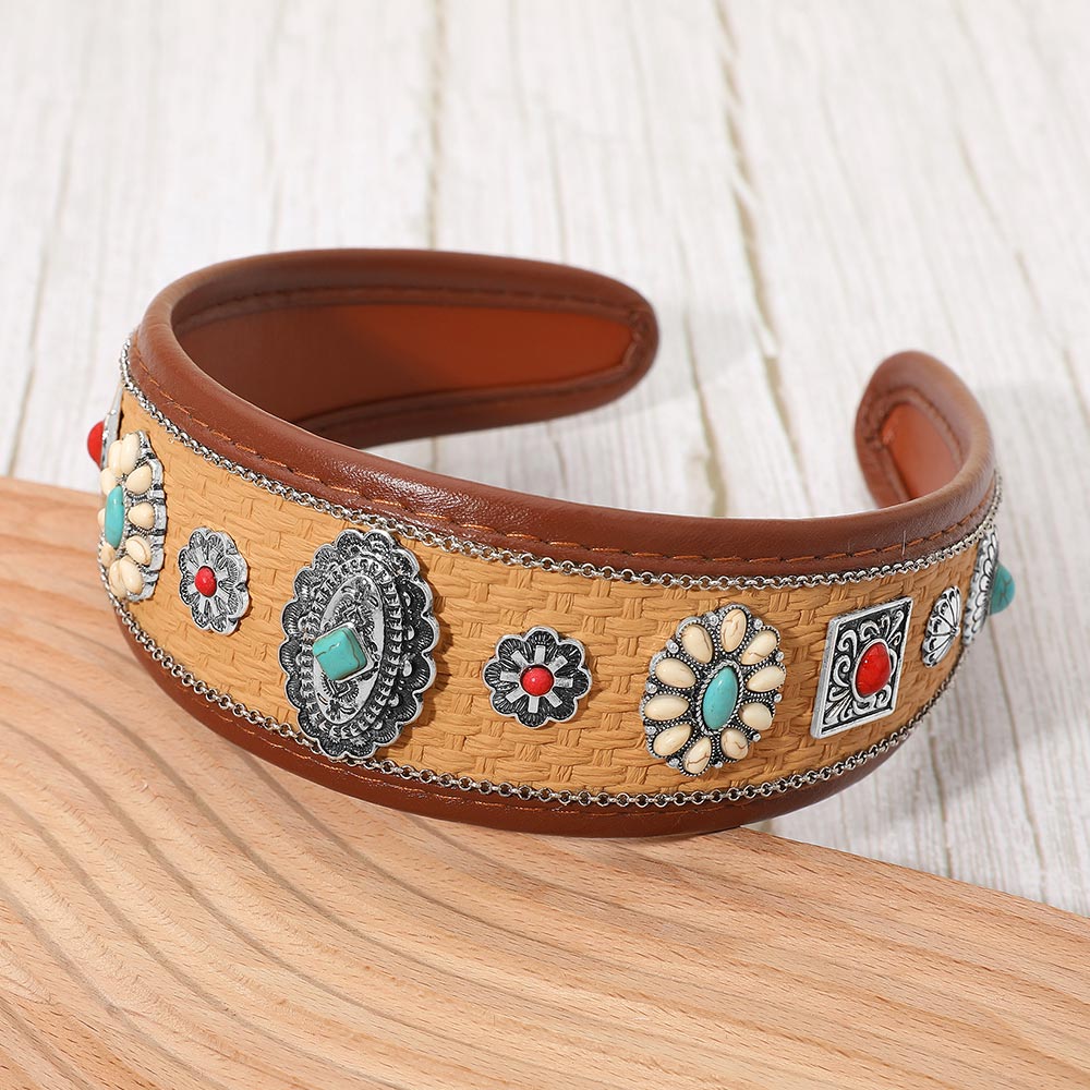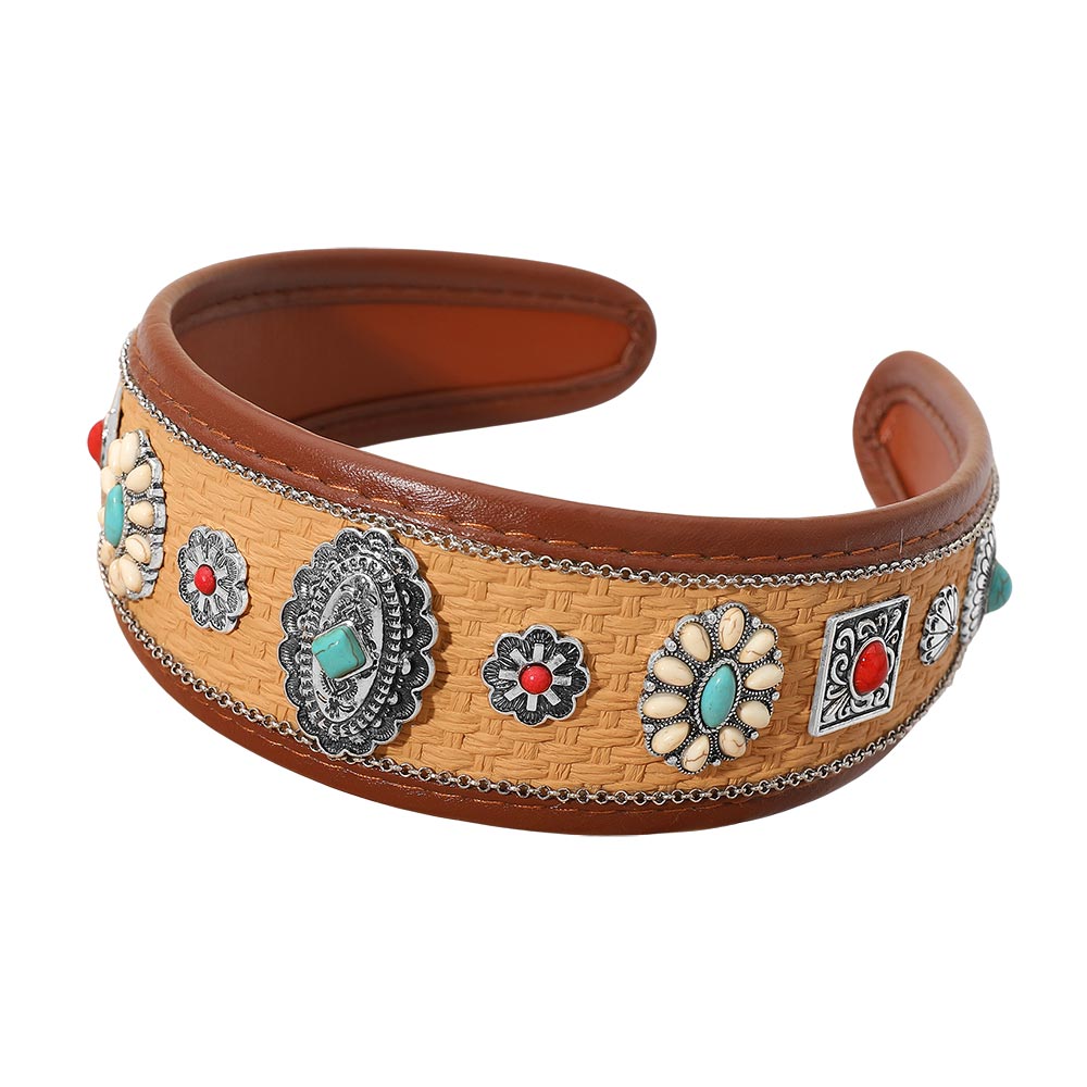 Details • Size : 2" H • Rustic-inspired headband featuring embossed concho details and gem-style accents on a woven band. The intricate metal designs and contrast trim create a bold Southwestern aesthetic, perfect for boho-chic looks or adding western flair to everyday wear.