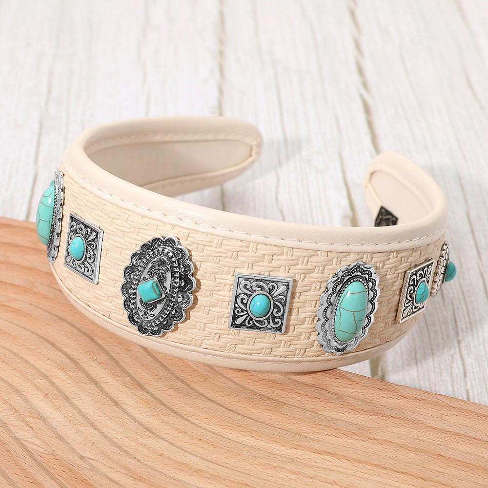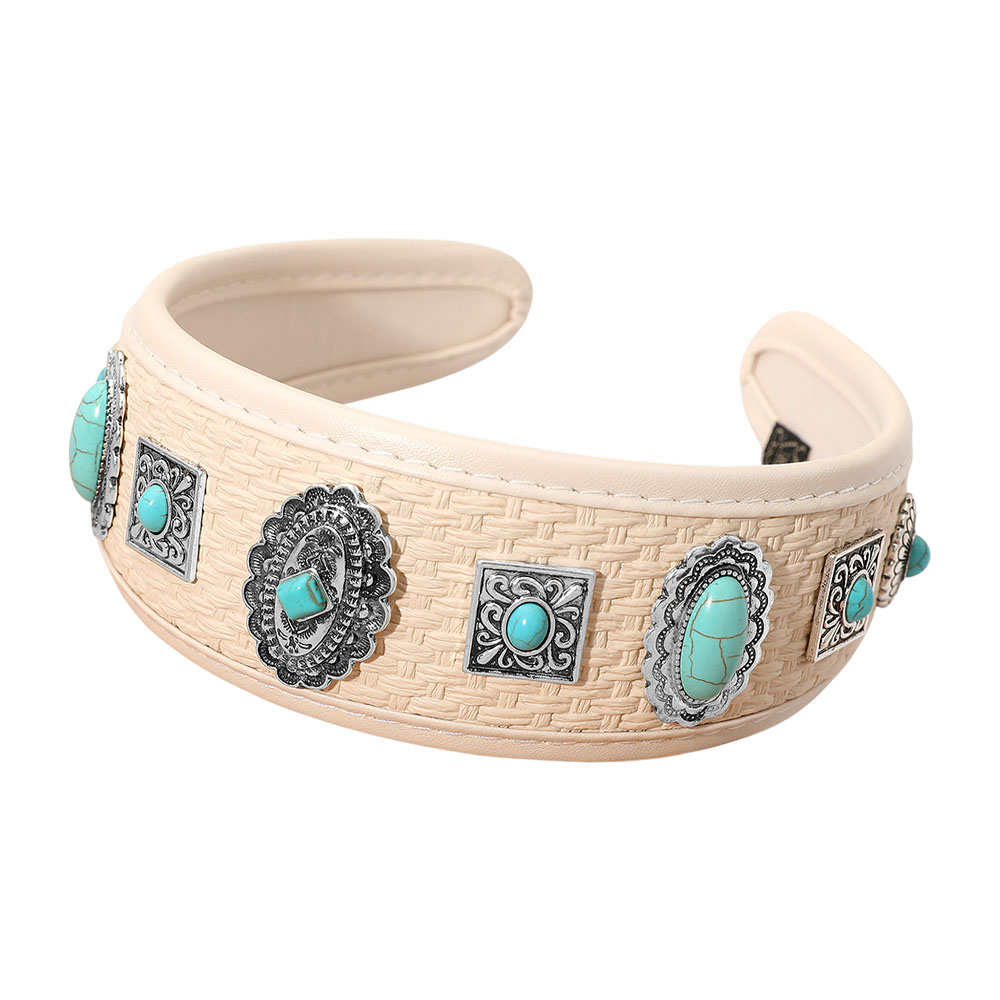 Details • Size : 2" H • Chic western-style headband featuring turquoise-inspired concho embellishments on a textured woven band. Detailed metal accents and soft trim add a refined boho touch, making it the perfect accessory for casual outfits or Southwestern-inspired looks.