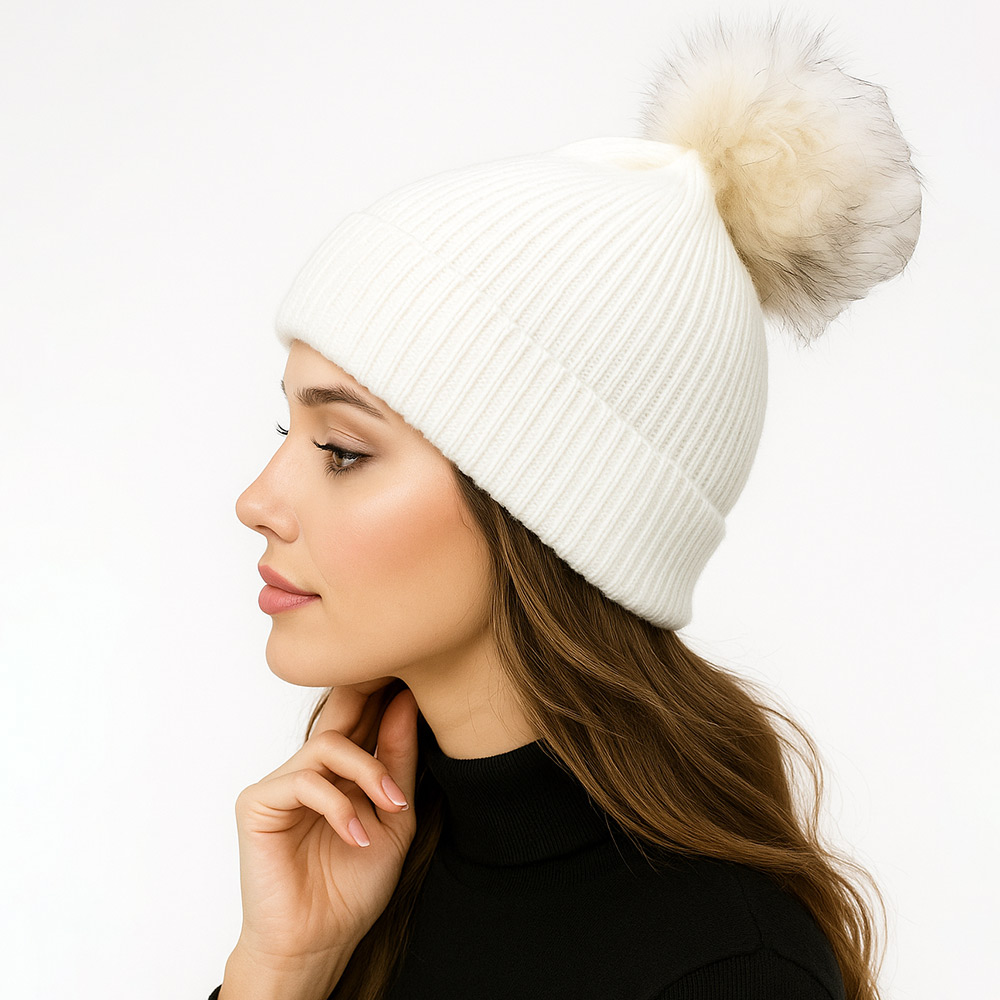 • Stay stylish and warm with this ribbed knit beanie featuring a soft fox fur pom on top. Its snug fit and plush texture make it perfect for cold days, outdoor activities, or everyday wear. A trendy winter essential that adds playful charm while keeping you comfortably cozy all season long.