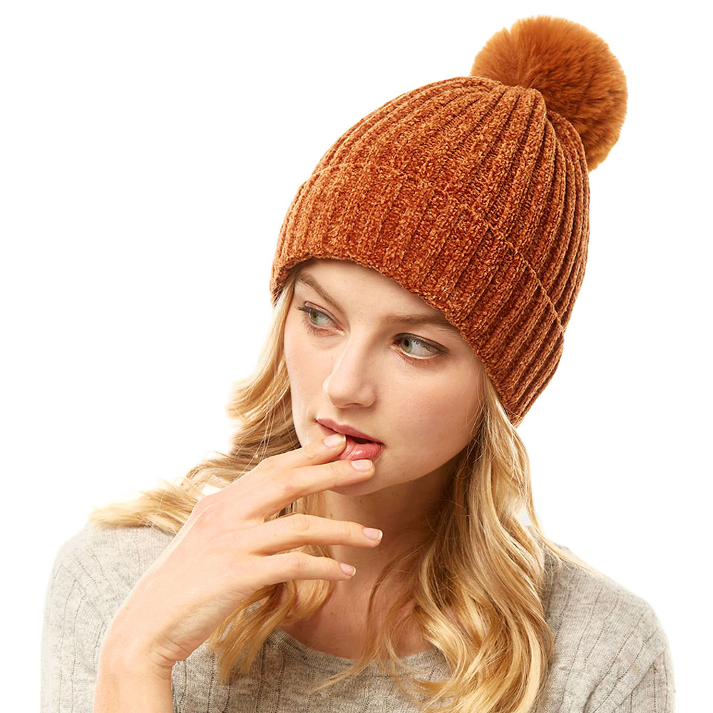 Genuine Fox Fur Pom Pom Ribbed Knit Winter Beanie Hat