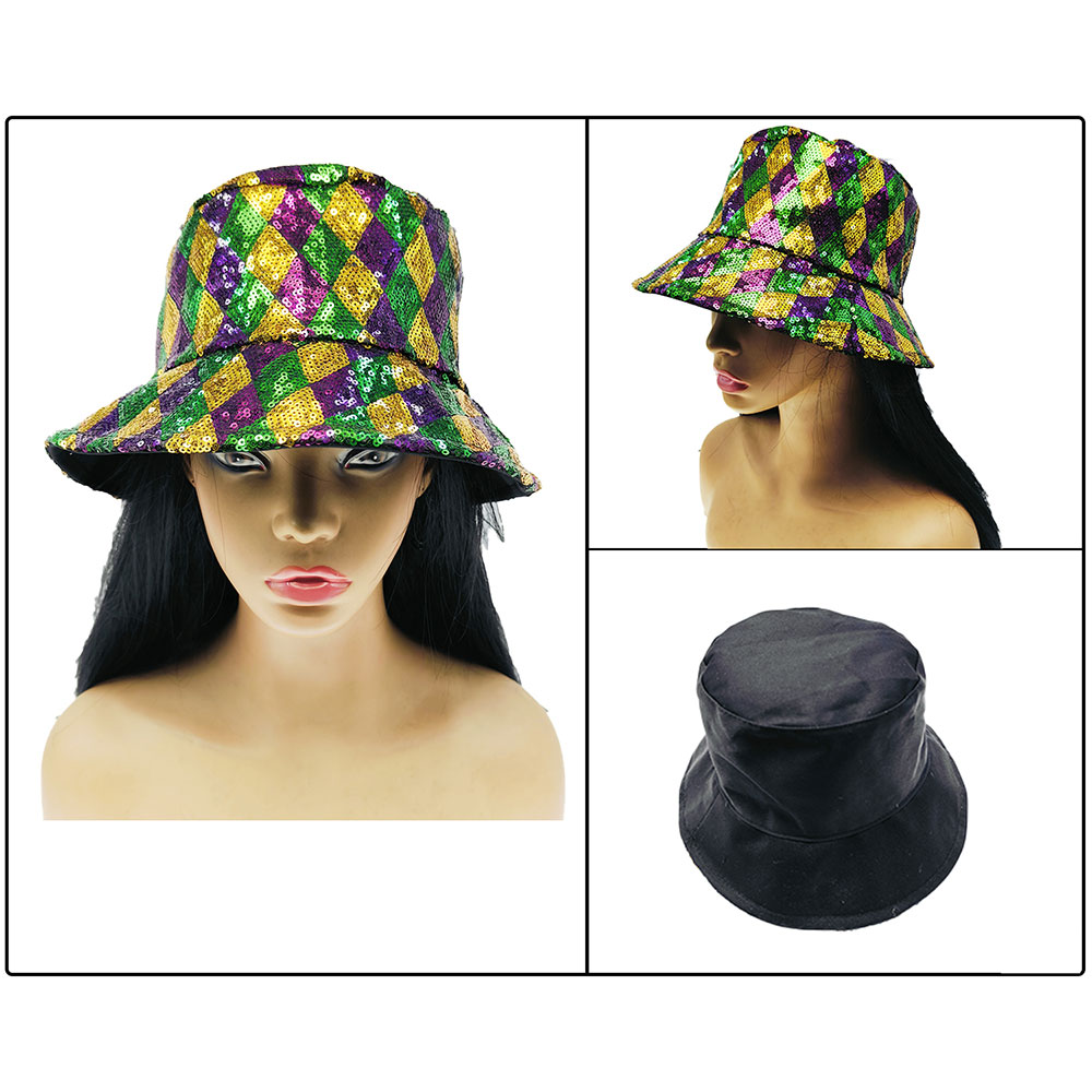 Details • Size : One Size • Add statement style with this sequin diamond pattern mardi gras bucket hat featuring a bold geometric design and classic bucket silhouette. Comfortable for all-day wear and easy to style, it’s ideal for festivals, concerts, themed events, or casual outfits that need a playful, standout finishing touch.