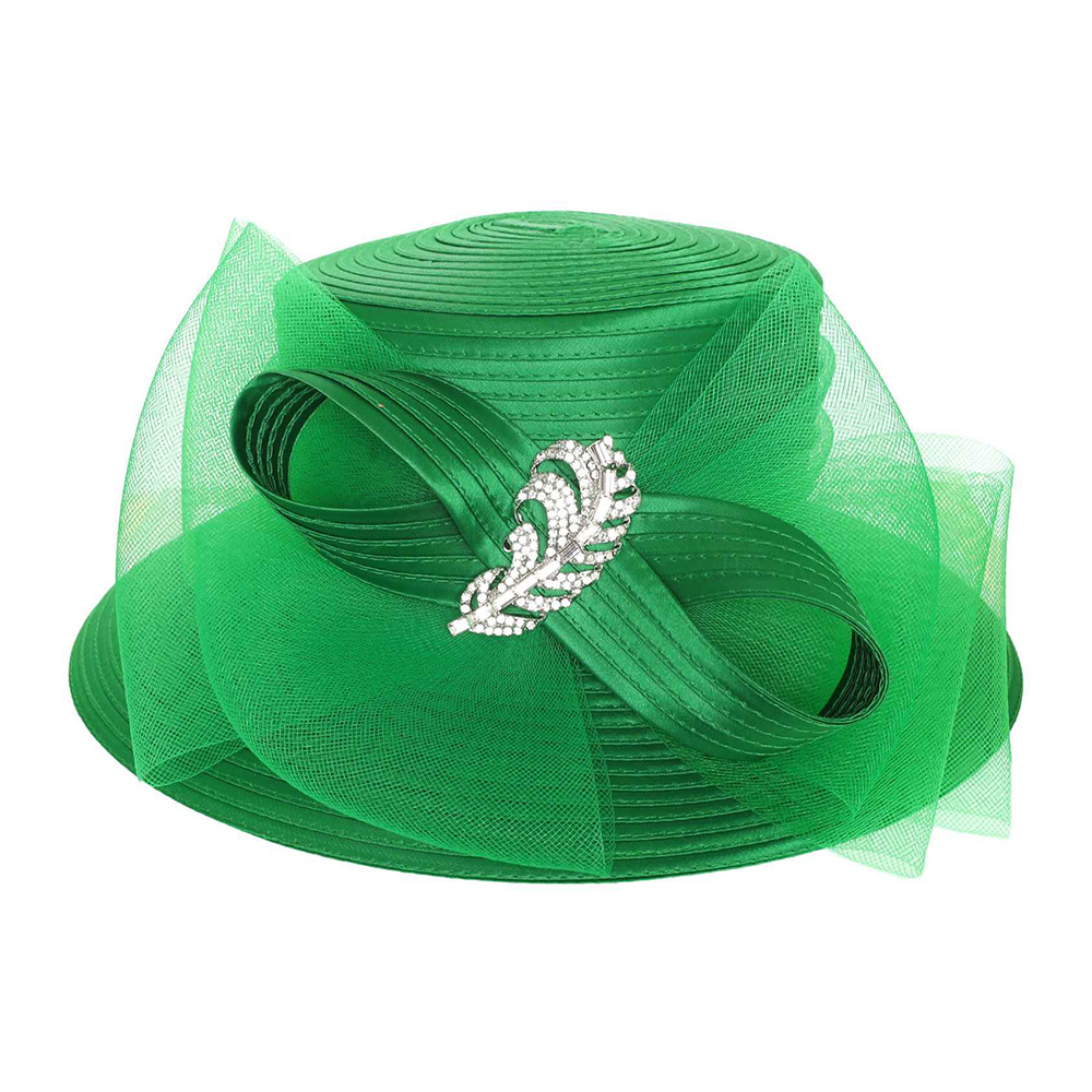 Rhinestone Embellished Feather Accented Mesh Bow Dressy Hat