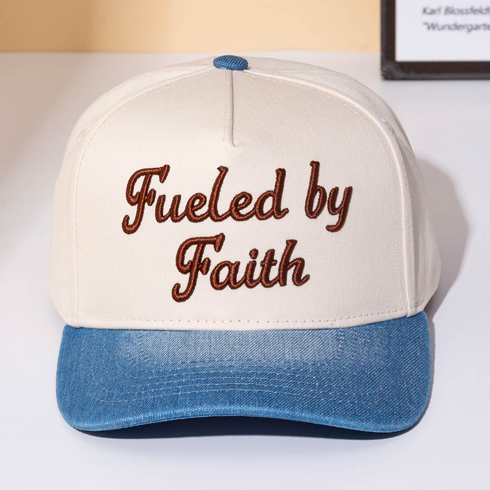 Details • Size : One Size • Motivational baseball cap featuring “Fueled by Faith” embroidered message for meaningful everyday wear. Designed for a comfortable fit and effortless styling with casual outfits. Perfect for daily errands, faith-based gatherings, travel, or gifting with an uplifting and confident statement.
