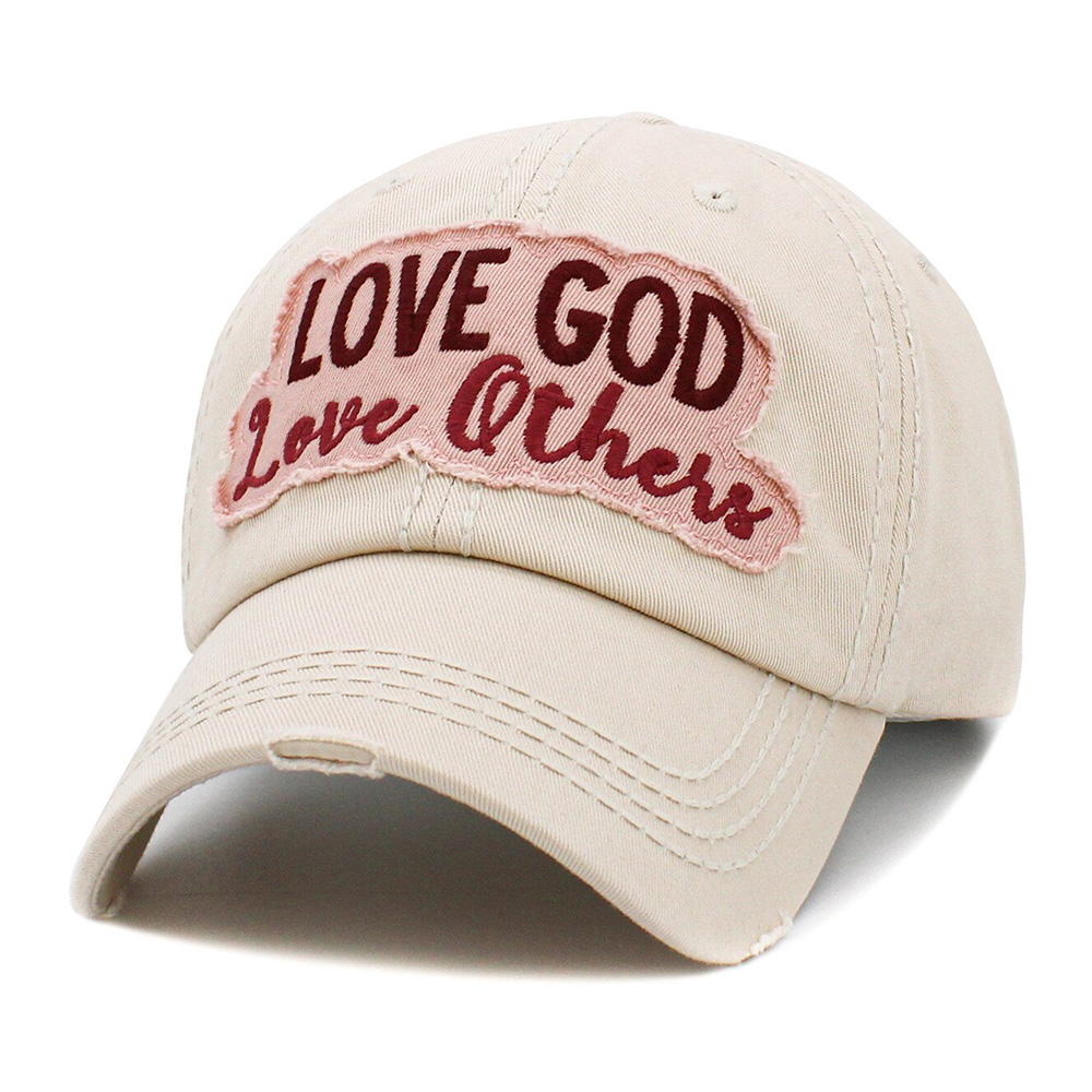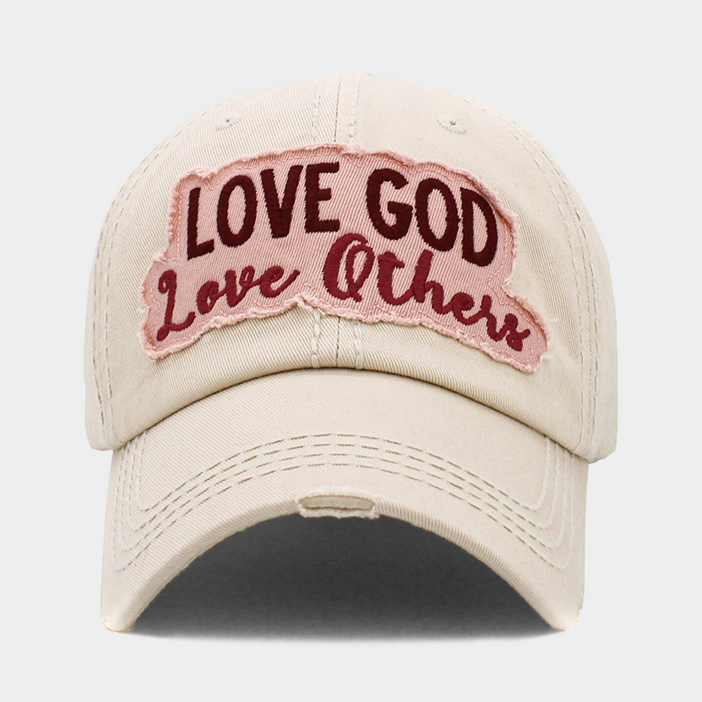 • Show faith and kindness with this distressed baseball cap featuring the inspirational phrase “Love God Love Others.” Stylish with contrast stitching and a comfortable fit, it’s the perfect everyday accessory to spread positivity and encouragement.