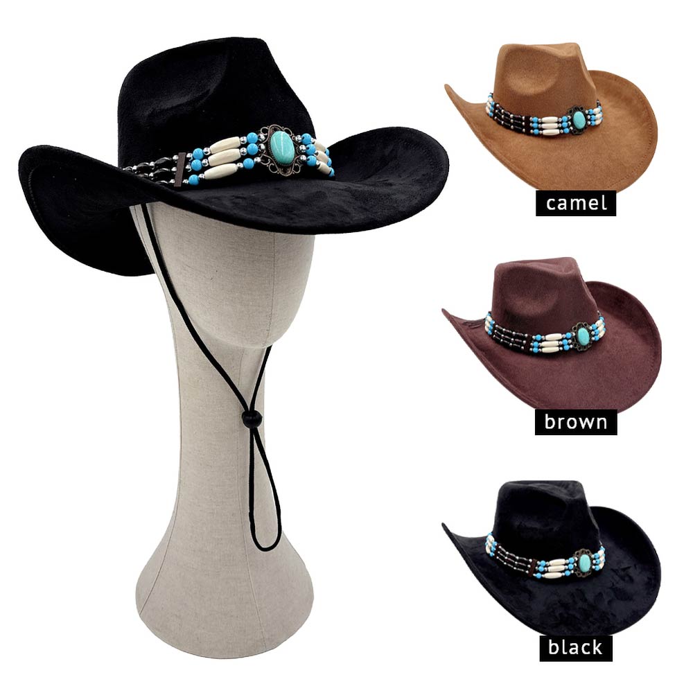 • This western-style cowboy hat showcases a structured silhouette finished with a detailed beaded band and bold centerpiece accent. Designed to elevate western, festival, and statement outfits, it blends classic cowboy appeal with decorative flair. A strong choice for boutiques looking for eye-catching headwear that delivers personality, styling versatility, and trend-driven appeal for customers seeking standout accessories.