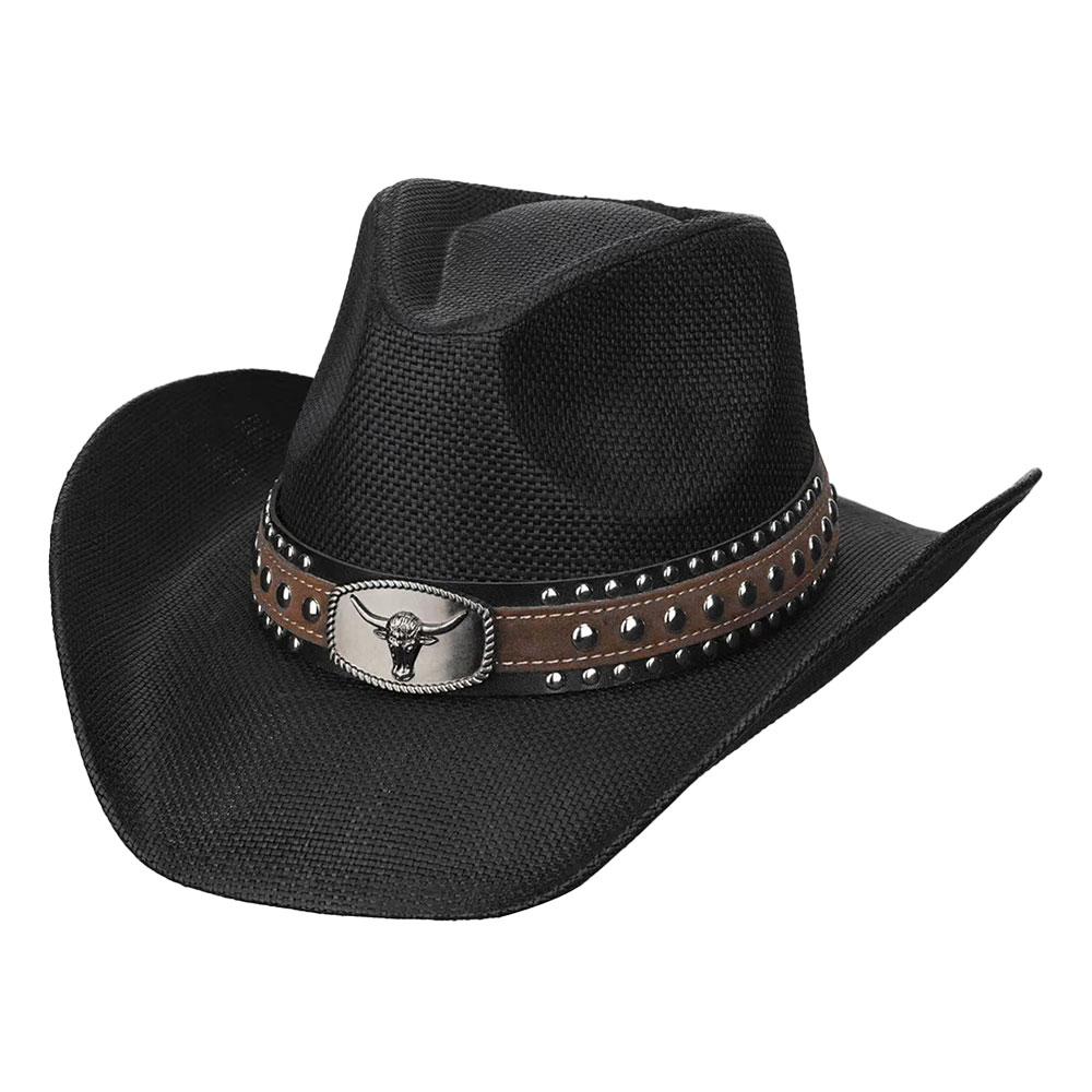 Details • Crown Circumference: 23" • Crown Height : 5.5" • Brim Width : 3.5" • Material : 100% Straw • Bold western-inspired cowboy hat featuring a structured silhouette and a stud-accented band with oval steer head buckle detail. Designed to elevate festival looks, themed collections, and statement outfits, this hat adds rugged character and standout style to any accessory assortment.