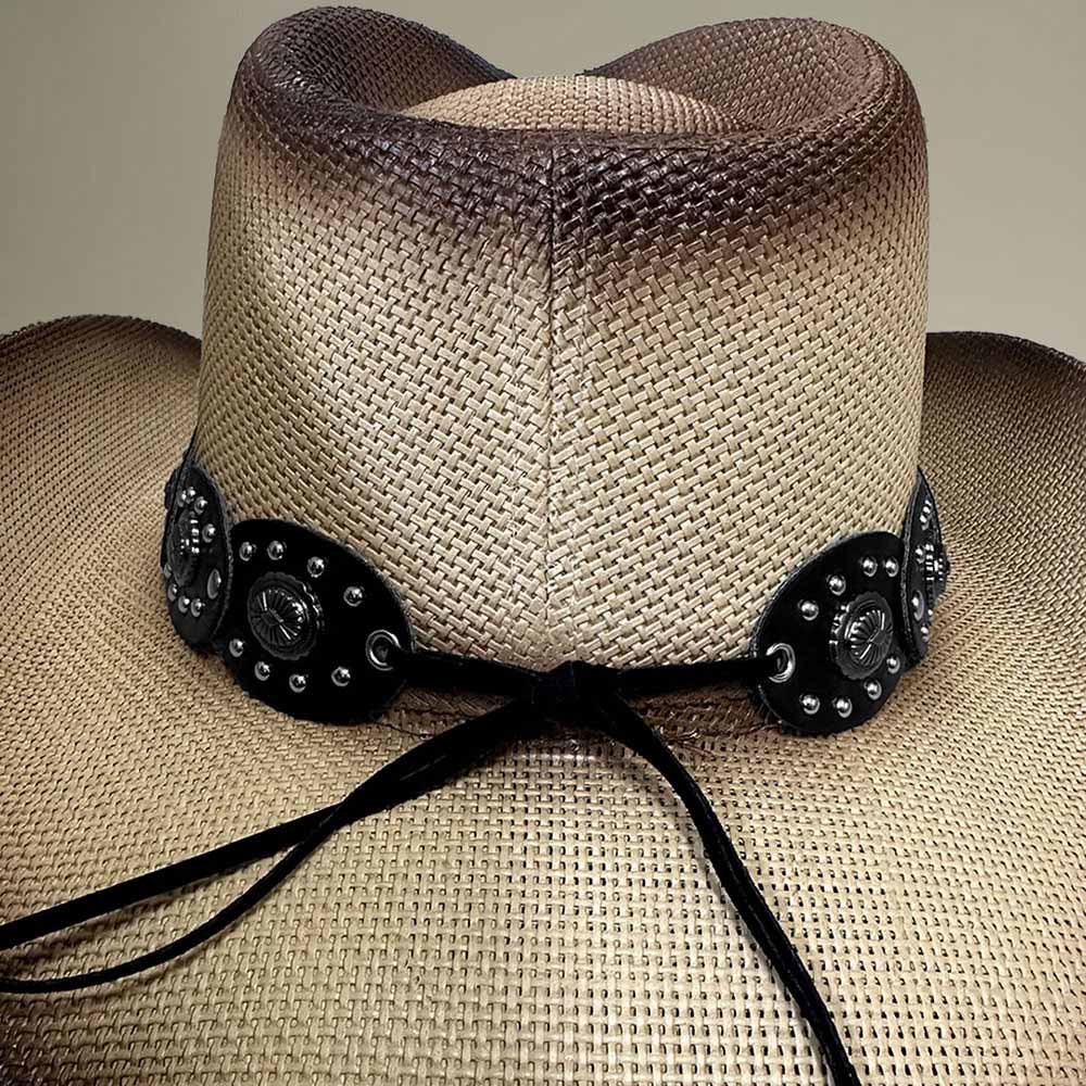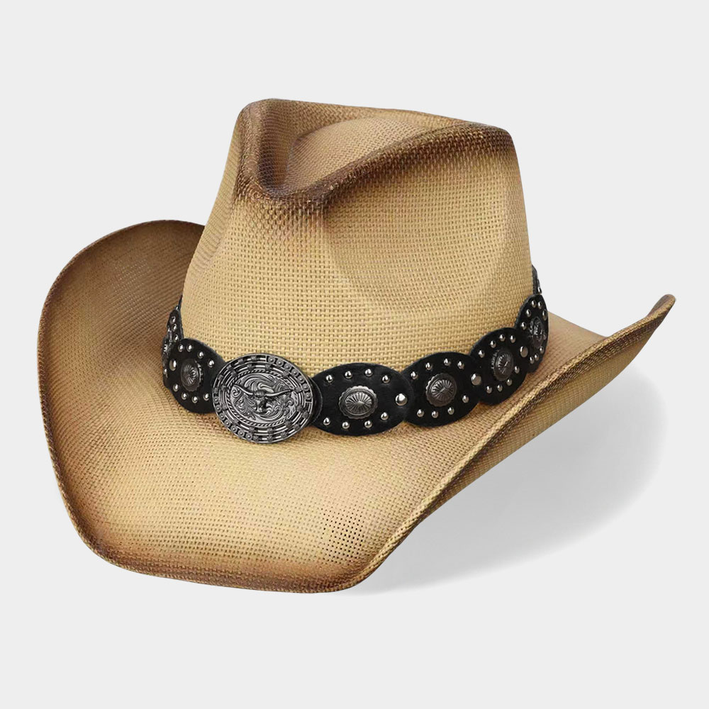 Details • Crown Circumference: 23" • Crown Height : 5.5" • Brim Width : 3.5" • Material : 100% Straw • Bold western cowboy hat featuring a structured crown, curved brim, and an ornate medallion band with decorative stud detailing. Designed for western fashion collections, rodeo styling, festivals, and themed outfits, this statement hat adds authentic western character and standout appeal.