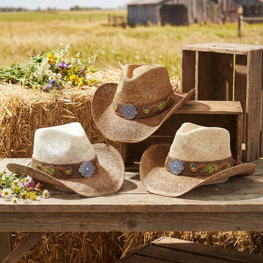 Boho Two Tone Rhinestone Studded Floral Concho Band Western Straw Cowboy Hat