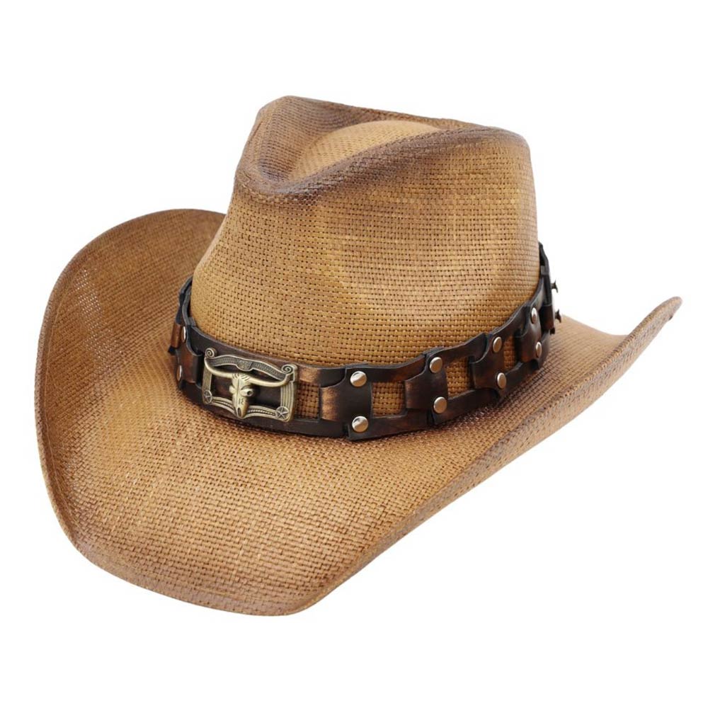 Longhorn Steer Head Buckle Accent Rugged Studded Band Western Straw Cowboy Hat