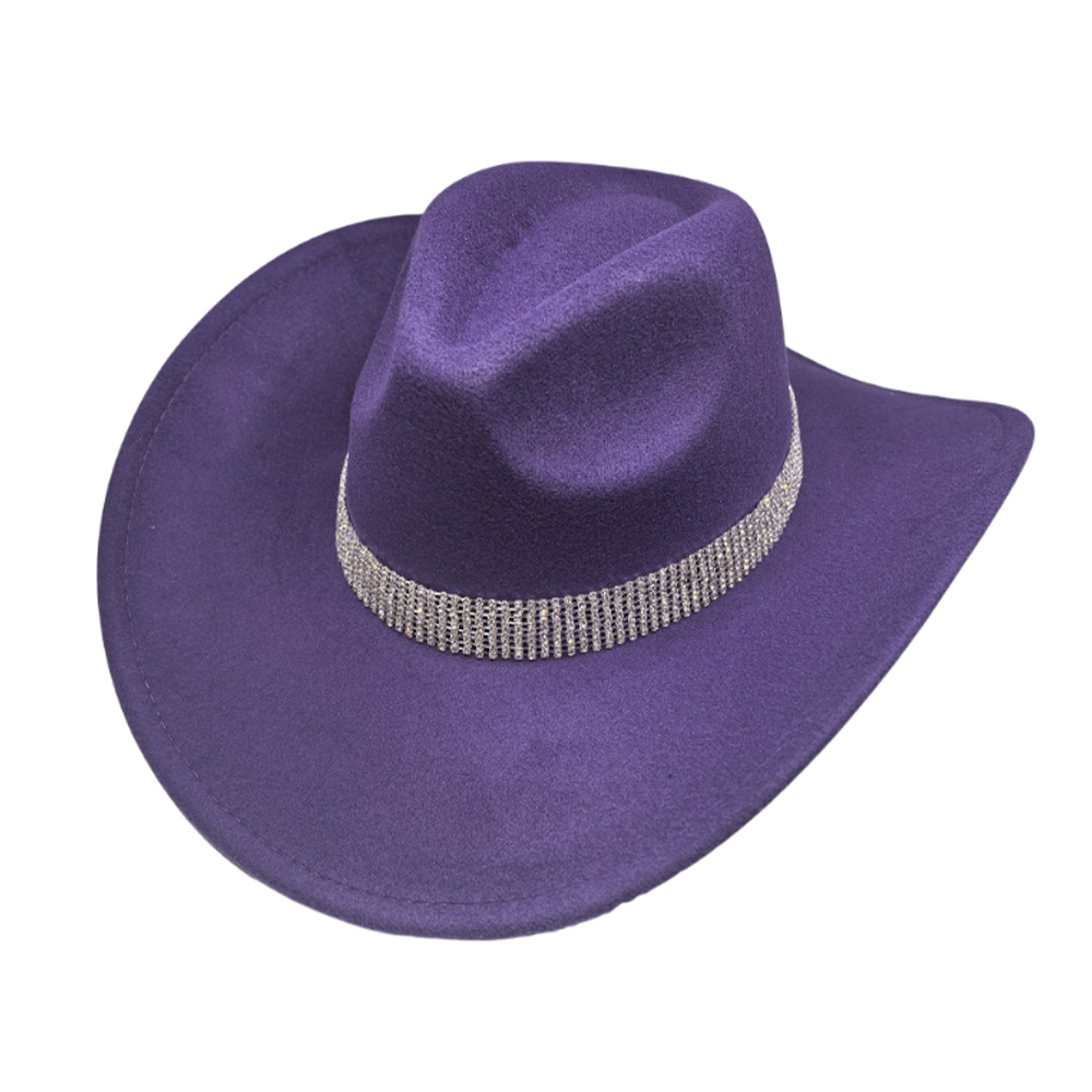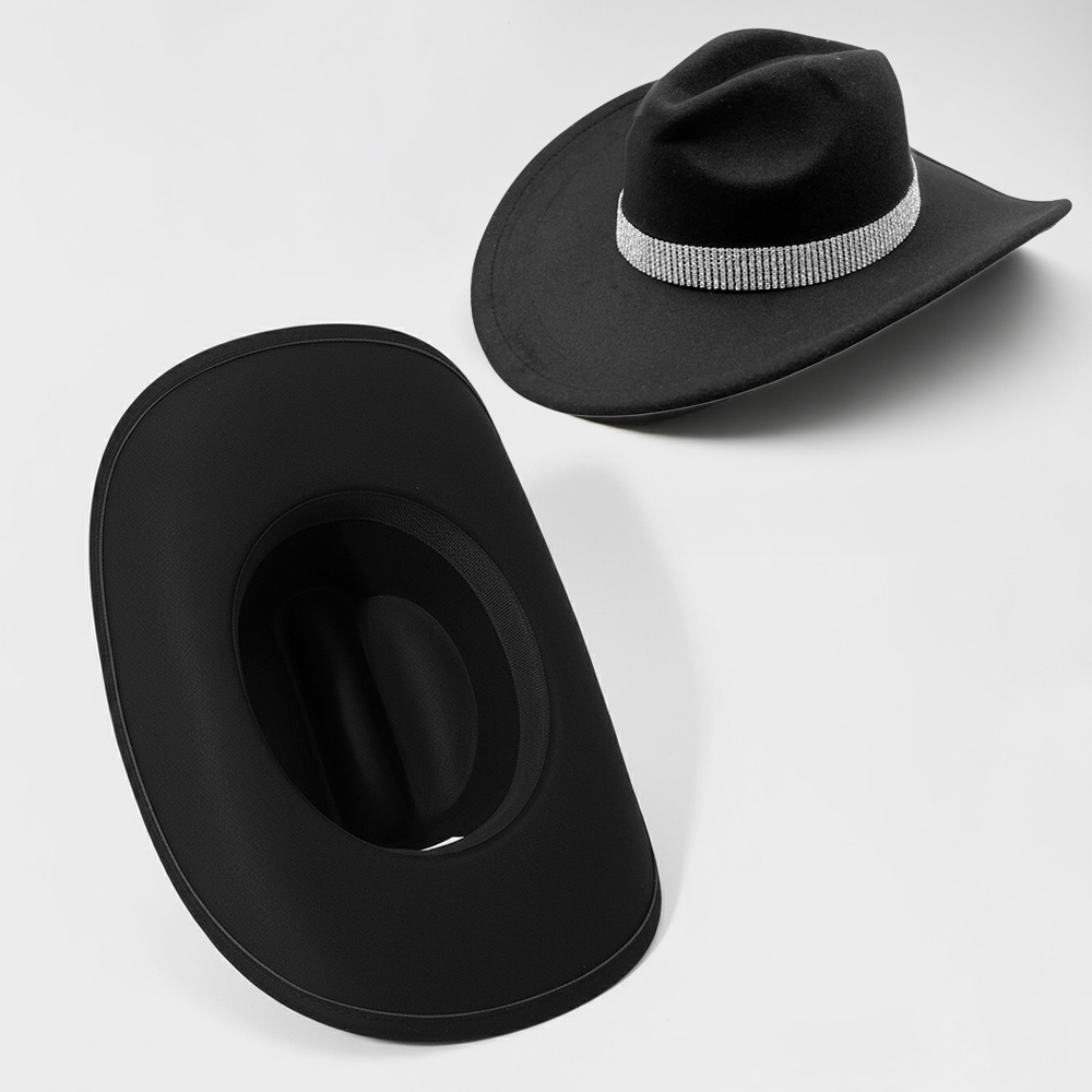 Details • Crown Circumference : 23" • Crown Height : 4.75" • Brim Height : 3.5" • Material : 100% Polyester • Make a striking impression with this wide-brim statement cowboy fedora hat featuring a glimmering crystal band. Designed for timeless elegance and modern sophistication, it adds a touch of glamour to any outfit—perfect for upscale events, travel, or fashionable daywear.