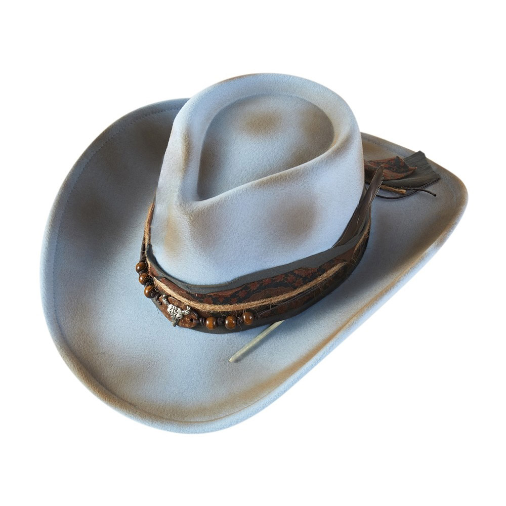 Steer Head Accent Feather Beaded Band Rustic Vintage Distressed Western Cowgirl Fedora Hat