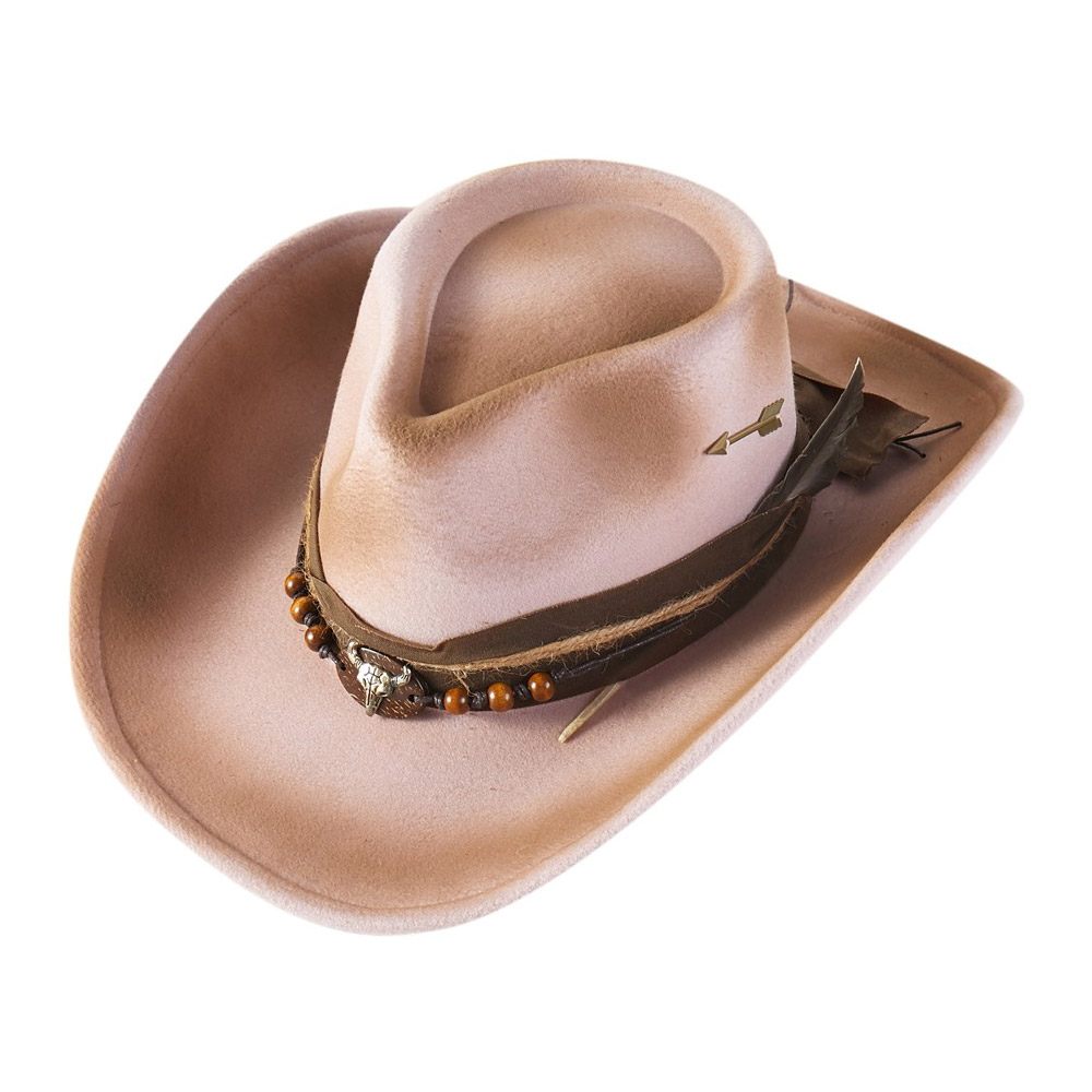 Details • Crown Circumference : 23" • Crown Height : 4.5" • Brim Height : 3.75" • Material : 100% Polyester • Show off timeless western charm with this Western Style Hat featuring a handcrafted beaded band and feather accent. Designed with a classic distressed finish, it delivers rugged sophistication and everyday comfort—perfect for festivals, travel, or casual outdoor adventures.